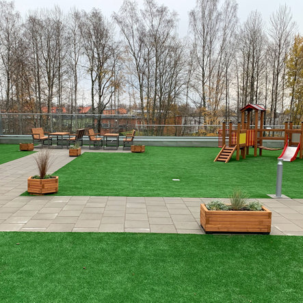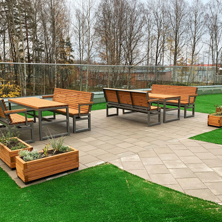 - Træ : Træ er et naturmateriale og bør tilses jævnligt for revner, splinter og generel slitage. Rengør med en blød børste eller fugtig klud. For at forlænge levetiden anbefales det at behandle træet med egnet træbeskyttelsesmiddel efter behov og altid sikre, at kontaktflader mod jord holdes fri for konstant fugt.