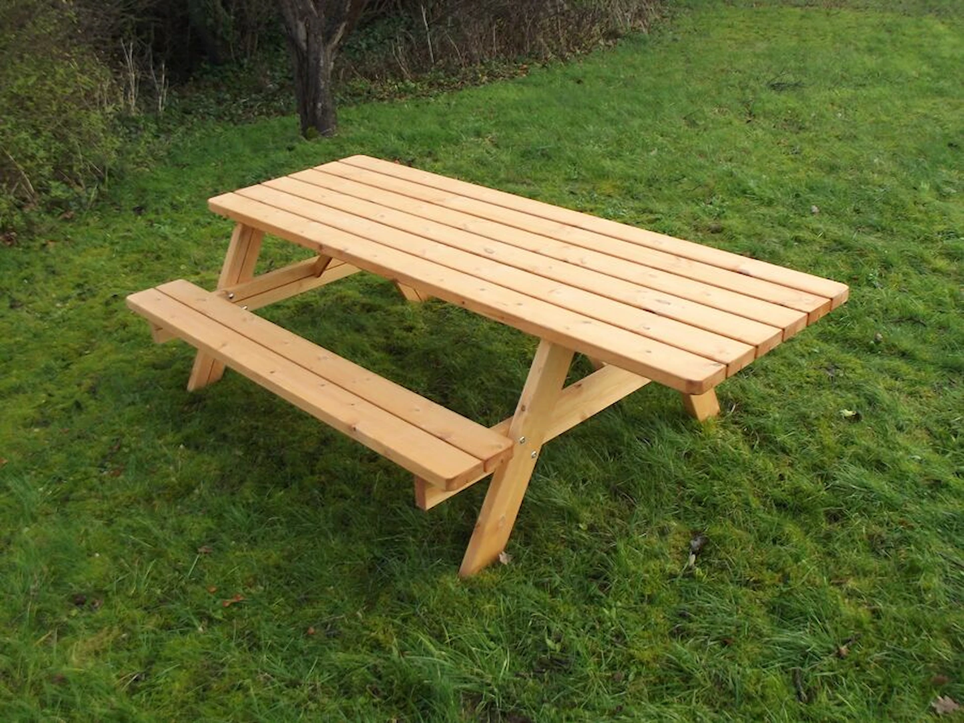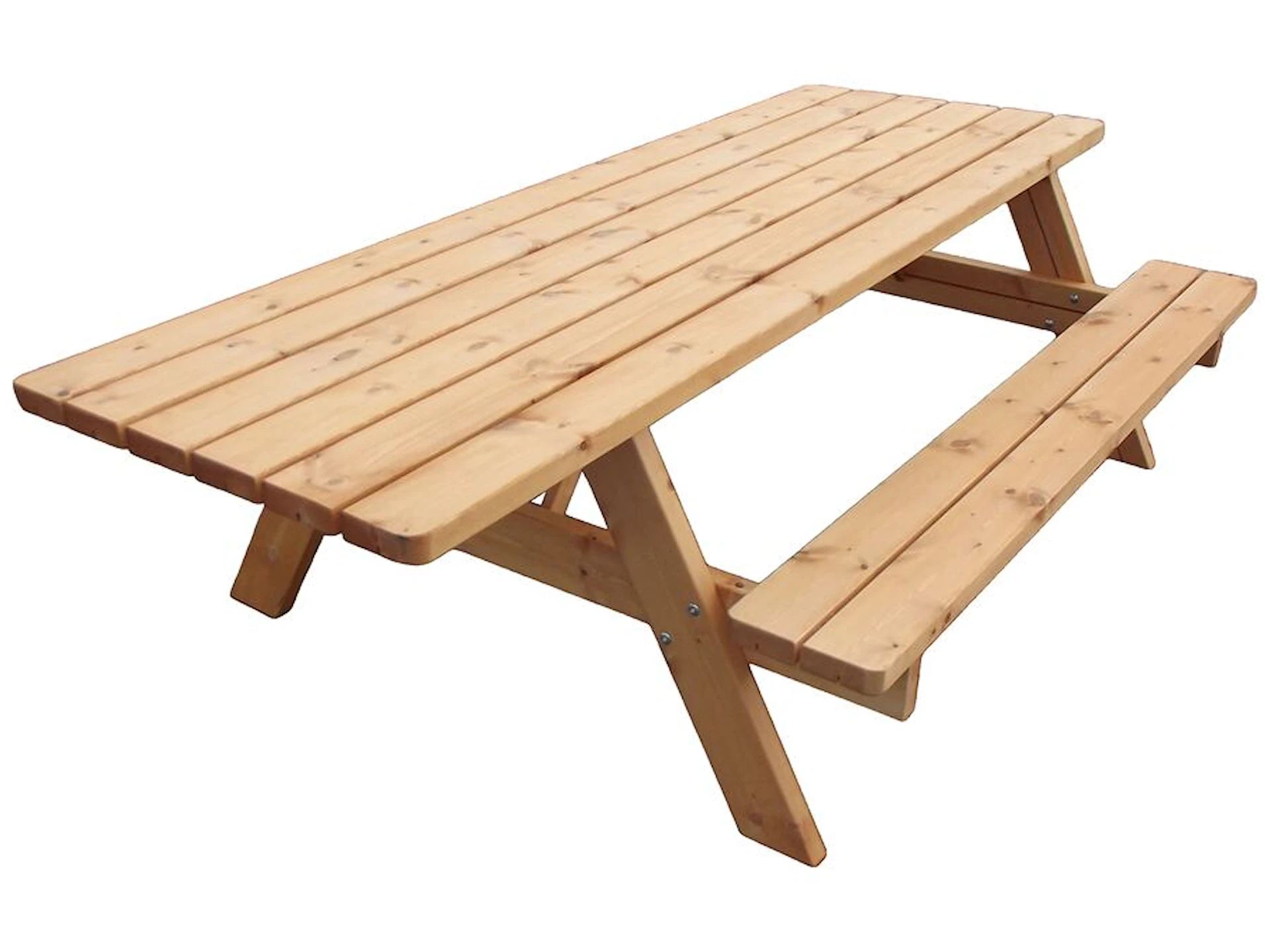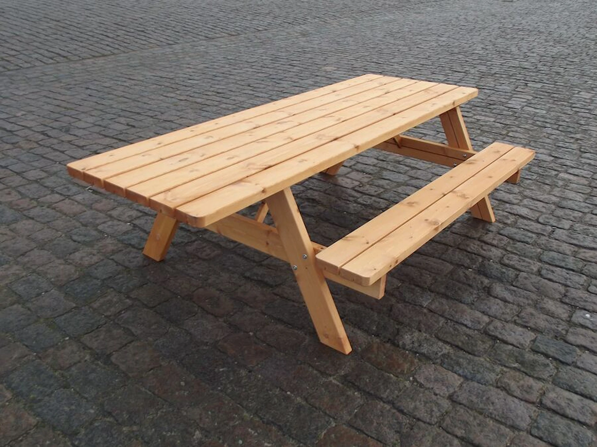Dette bord-bænksæt har en unik funktion med ekstra længde på bordpladen i den ene ende, så der også er plads til kørestolsbrugere. Sædehøjden er 43 cm, og bordhøjden er 72 cm.
