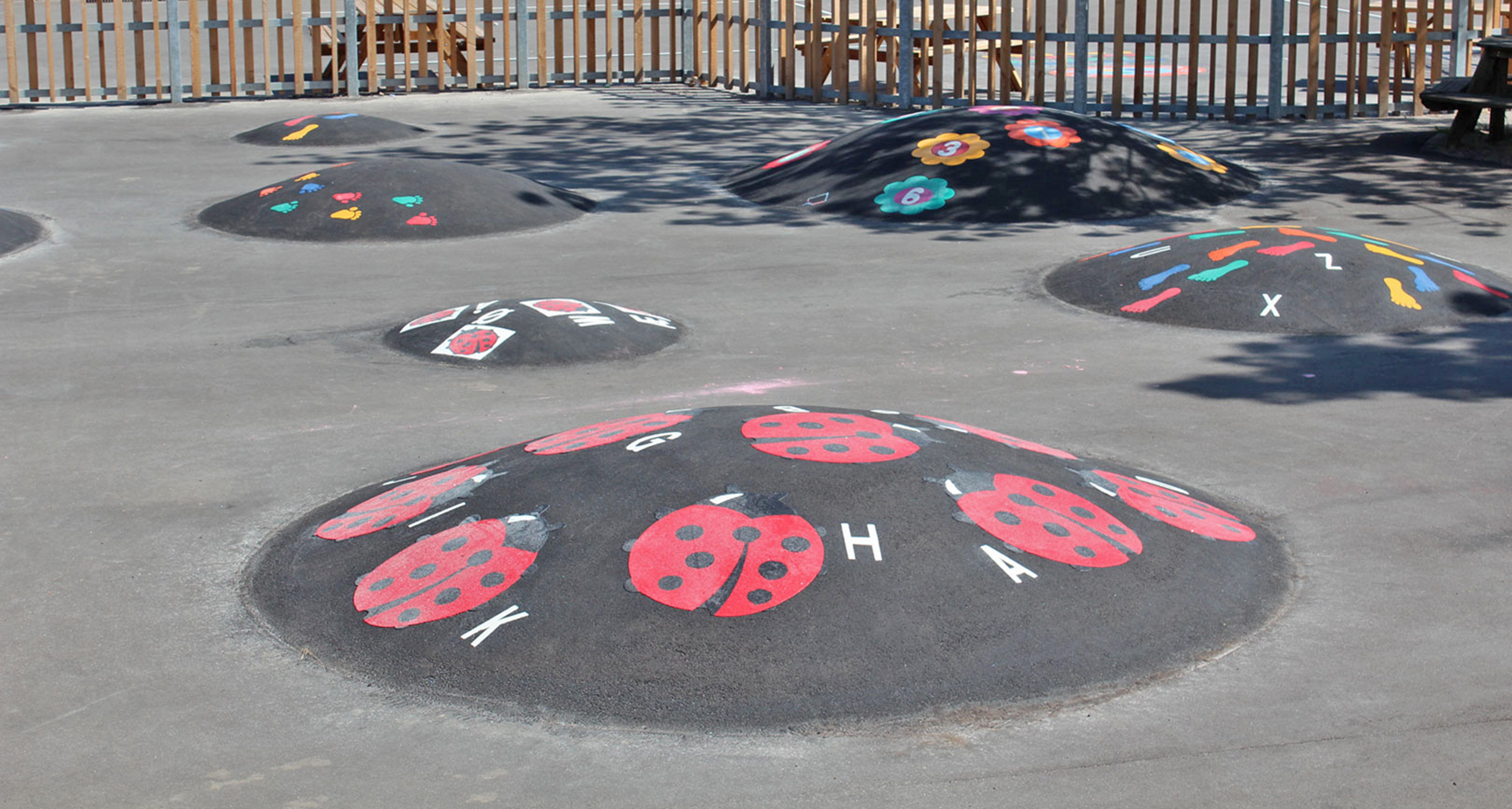 Asfaltopstregninger på skolens område kan indgå i undervisningen udover at skabe trivsel og vække børnenes nysgerrighed og fantasifuld leg.