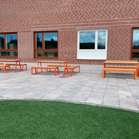 - Træ : Træ er et naturmateriale og bør tilses jævnligt for revner, splinter og generel slitage. Rengør med en blød børste eller fugtig klud. For at forlænge levetiden anbefales det at behandle træet med egnet træbeskyttelsesmiddel efter behov og altid sikre, at kontaktflader mod jord holdes fri for konstant fugt.