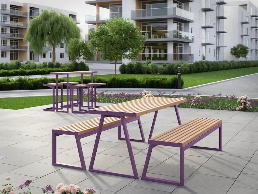 - Træ : Træ er et naturmateriale og bør tilses jævnligt for revner, splinter og generel slitage. Rengør med en blød børste eller fugtig klud. For at forlænge levetiden anbefales det at behandle træet med egnet træbeskyttelsesmiddel efter behov og altid sikre, at kontaktflader mod jord holdes fri for konstant fugt.