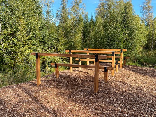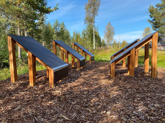 Materialer og farver på legeredskaberne er valgt med omhu, så de matcher naturen og de omkringliggende bygninger.