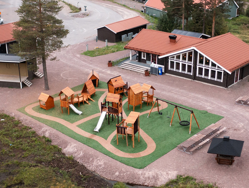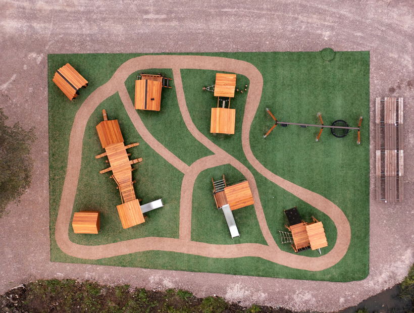 Kunstgræsset er valgt på grund af dets holdbarhed og gjorde det muligt at skabe spændende stier mellem de forskellige legehuse.