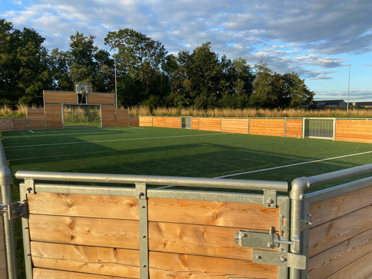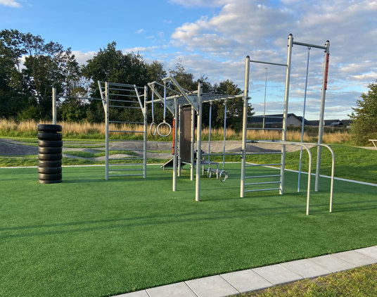 Ved Romalt Aktivitetshal har man nu fået et udendørs aktivitetsområde med plads til både leg og bevægelse samt med mange opholdspladser fordelt i området.