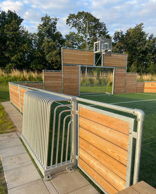 Aktivitetsområdet er inddelt i flere sammenhængende zoner – en multibane til diverse boldspil, et område til udendørs træning, et centreret opholdsområde med mange siddepladser under solsejl og et område med udendørs bordtennis.