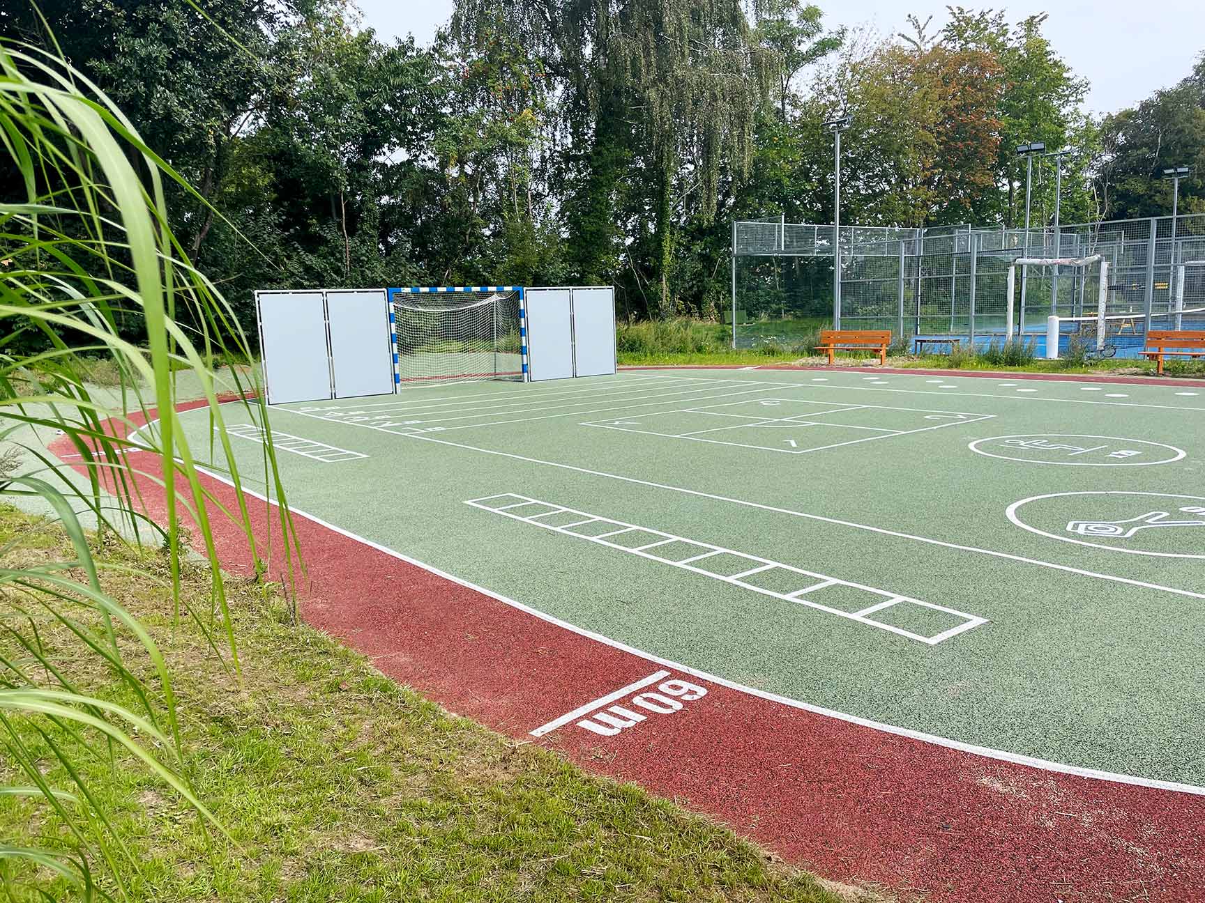 Midt i området ligger en funktionel pannabane. Det er en klar magnet for både børn, unge og voksne, der elsker hurtige bolddueller med plads til boldkontrol i topklasse. Rundt om banen er gummiblokkene med til at trække endnu flere ind i området. Disse parkour-blokke fungerer både som balanceelementer, springplatforme og en naturlig afgrænsning af området – og er samtidig rigtig gode at sidde på.