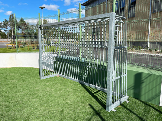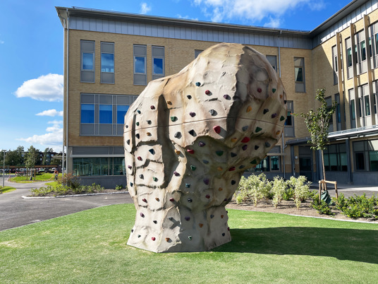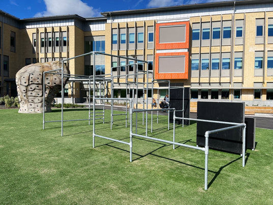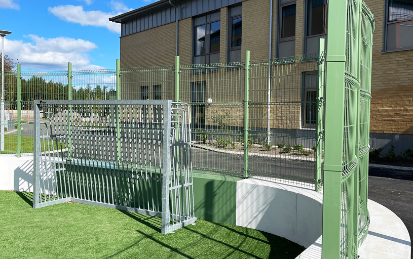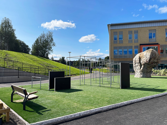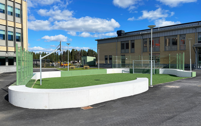 Den nybyggede Carlslundsskole i Umeå huser elever fra 7.-9. klasse og indretningen af skolegården skulle selvfølgelig matche aldersgruppen. Her findes derfor bl.a. en InsideOut multiarena, et parkourstativ, den store Boulder Rocks klatresten og udendørs bordtennisborde. Alt stål er pulverlakeret i den flotte RAL-farve 6011 Reseda Green, som matcher skolegårdens omgivelser.