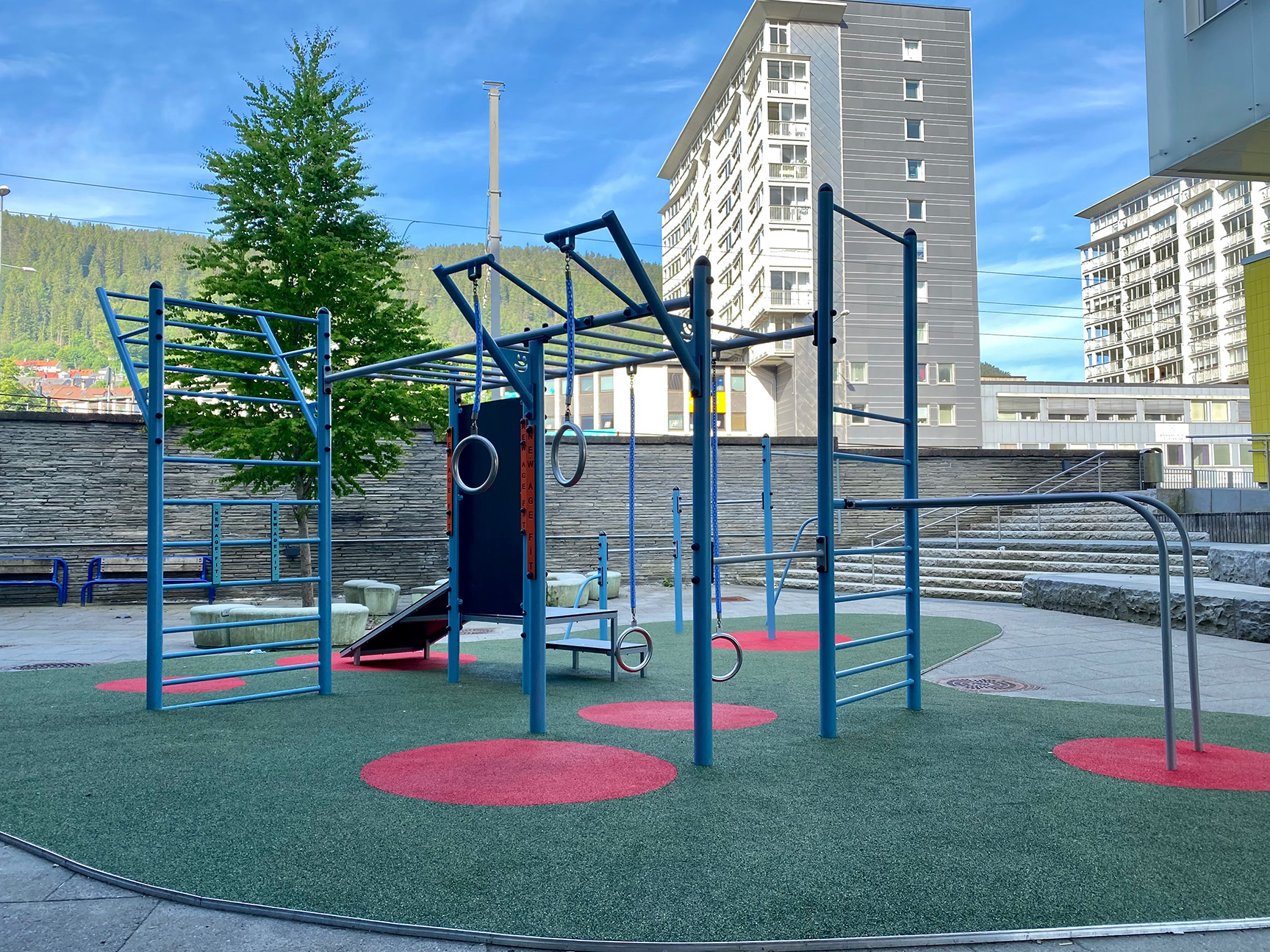 Lange dage på skolebænken kan gøre eleverne tunge i hovedet – men udendørs motion er med til at få hjernen i gang og klar til ny læring. På Årstad Videregående Skole får eleverne en værdifuld aktiv pause med træning på TRESSfit-stativet og boldspil på vores populære Goliath basketballstativ.