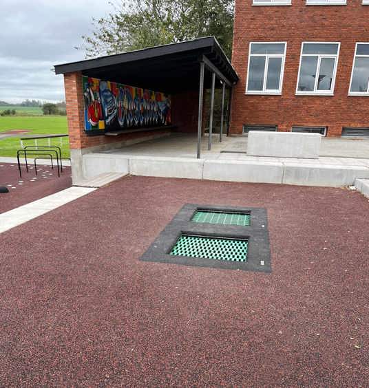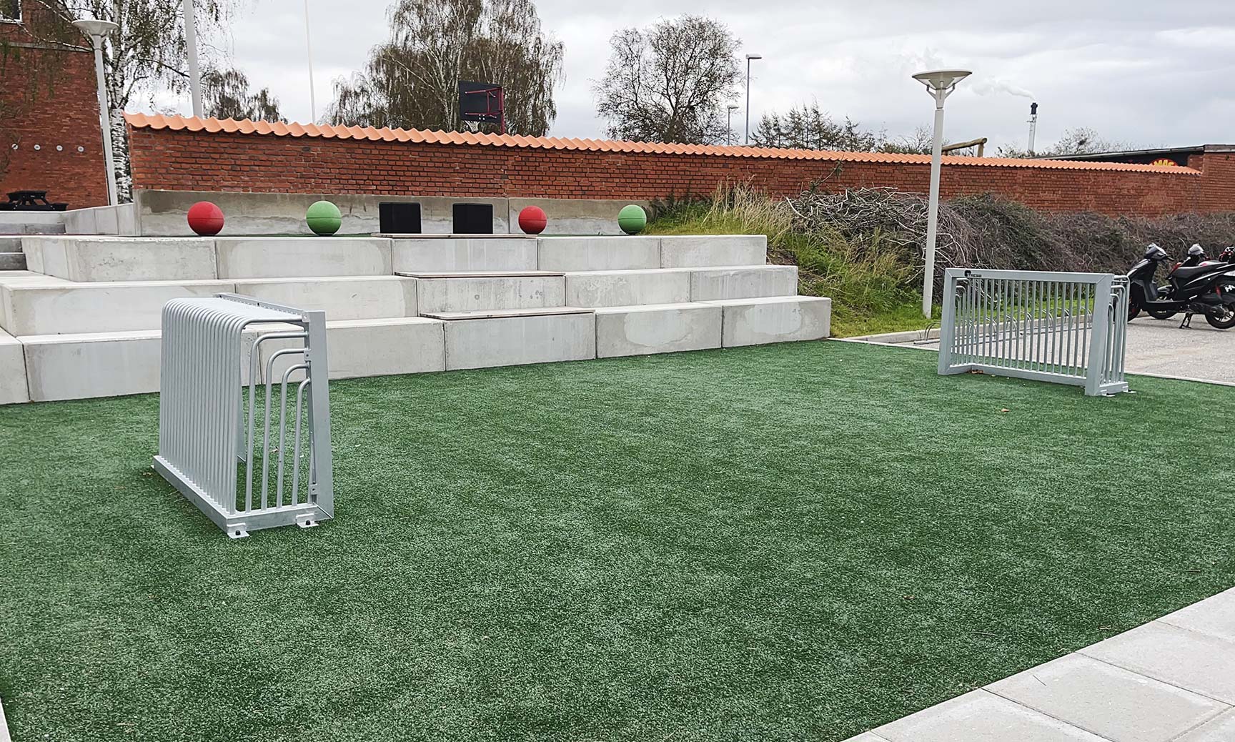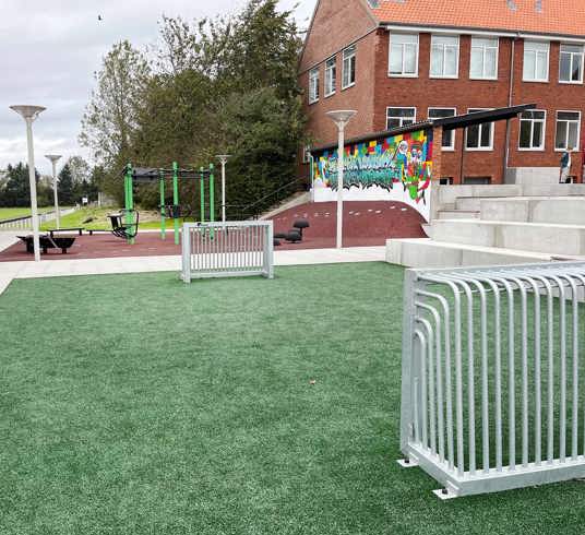 Projektets vision var at skabe et samlingssted mellem skole og hal ved at flette eksisterende – men adskilte – udeområder sammen til et samlende, aktivt byrum.