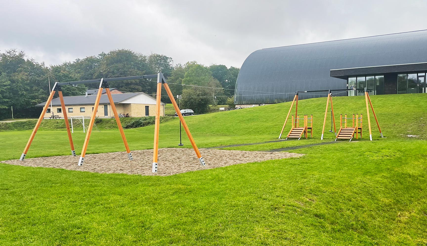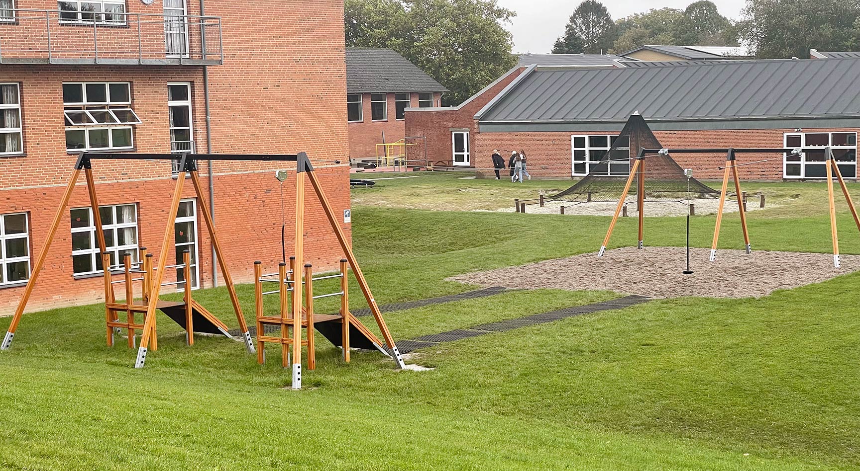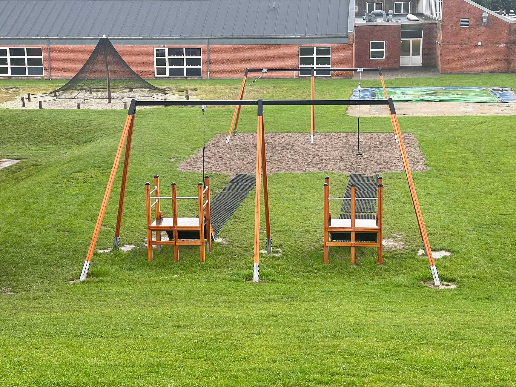 Skolen ønskede at opgradere skolegården med noget nyt til frikvarteret. Svævebanen med dobbelt platform passede perfekt ind på et eksisterende grønt areal og gør det muligt at svæve mod hinanden.