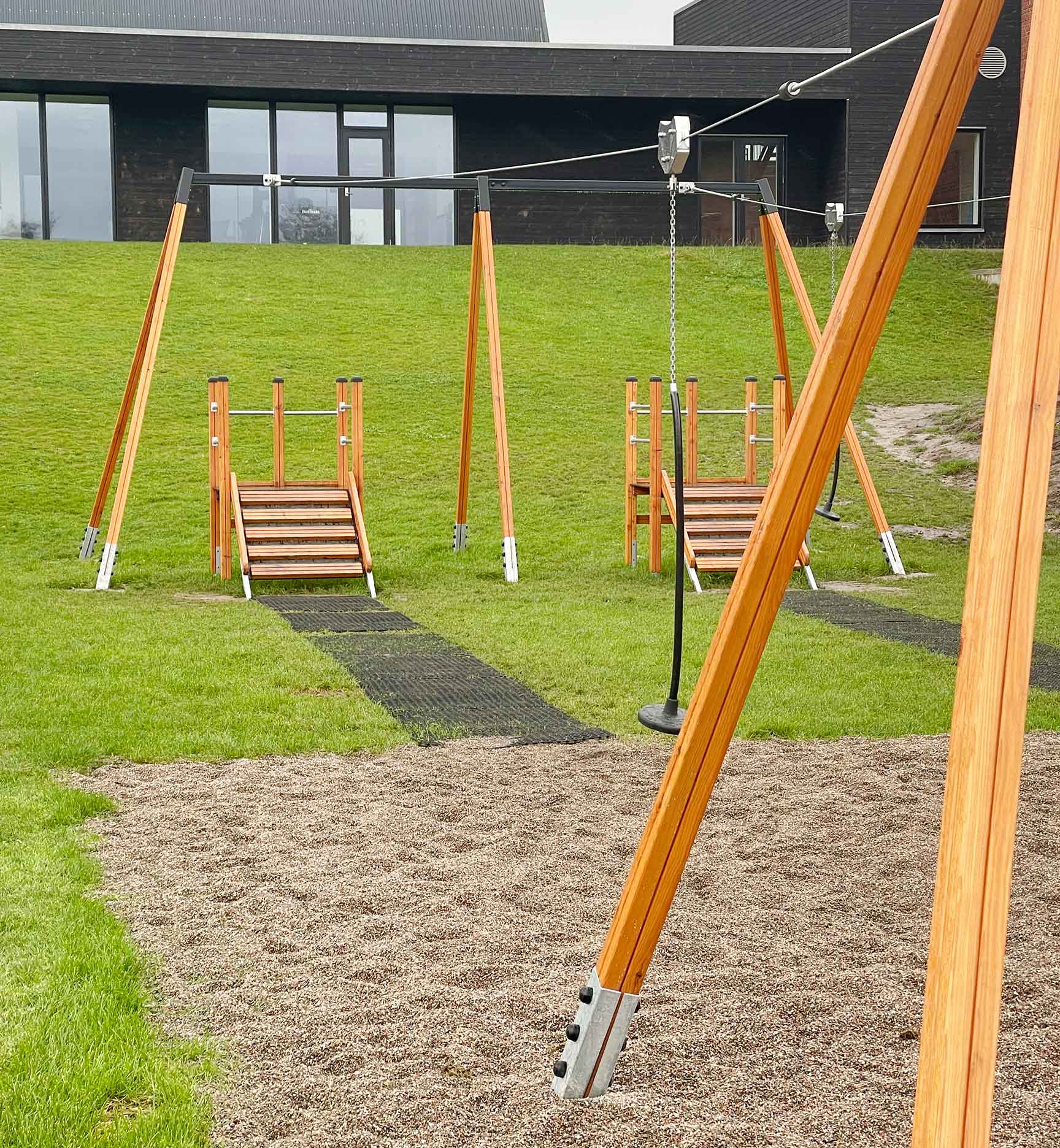 På Gråsten Skole ønskede man at opgradere skolegården med noget nyt til frikvartersleg. Valget faldt på en af vores populære svævebaner, som også passer perfekt ind på legepladser, campingpladser eller i offentlige parkmiljøer.