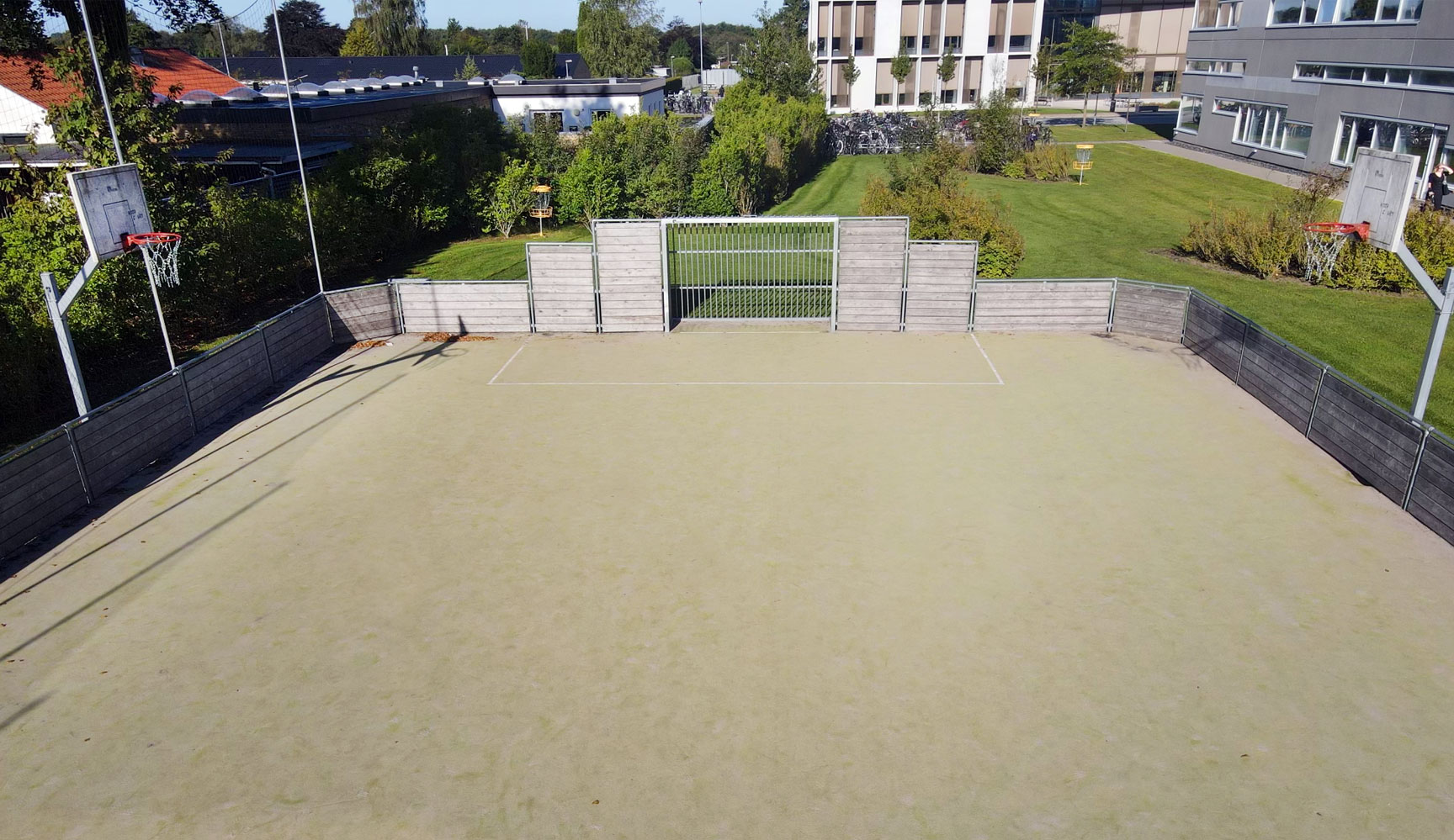 Den store multibane med bander lavet af 1. klasses høvlede lærketræsplanker giver rig mulighed for diverse boldspil på både de store endemål og de fire basketkurve. Banen bliver brugt hver eneste dag – og har her 6 år efter levering fået et patineret udtryk på især basketkurvene, som dog stadig er fuldt funktionsdygtige.