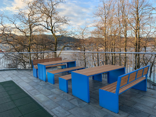 For de voksne er der mulighed for at nyde en kop kaffe med udsigt over fjorden, mens børnene leger på legepladsen.