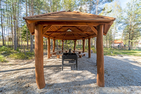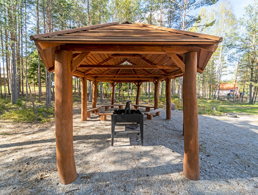 Legepladsens naturlige samlingssted er det store grillhus. Her er plads til både børn og voksne, når det er tid til samvær, kaffe, frokost eller måske en sangstund. Med praktiske, robuste bænke er det også et dejligt sted at socialisere på regnfulde dage. Nu starter vi grillen!