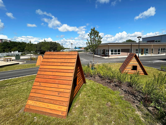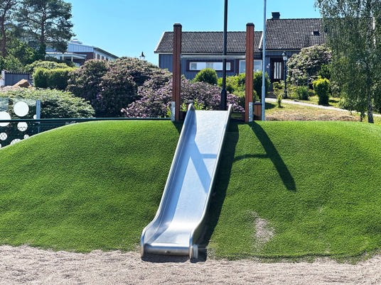 Arkitekten har fanget nogle af børnenes absolutte udendørsfavoritter; gemmesteder og højder. Perfekt til at lege gemmeleg i legehusene, trætønderne og i frøens tunnel. På bakkerne er der rutsjebaner i forskellige højder, som inviterer til masser af løb op og sus i maven på vejen ned. Og om vinteren bliver der kælketur, så snart sneen falder.