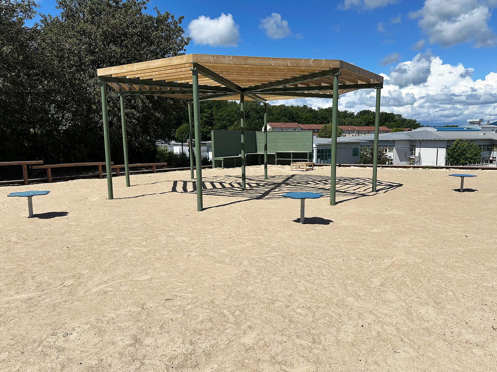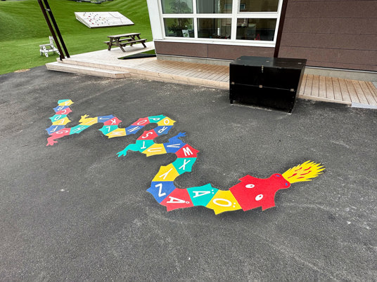 Udearealet indeholder legeredskaber, der tilbyder både leg, læring og hvilemuligheder. Her kan børnene hoppe hinke og samtidig øve sig på tal og alfabetet. Når de bliver trætte, kan de tage en hvilepause i hængekøjerne.