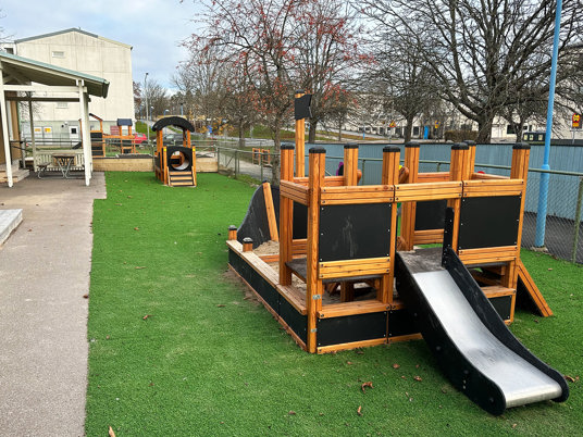 Børnehavens udeområde byder på noget for alle aldre med masser af variation med klatring, rutsjebane og sandleg. Båden med sandkasse og toget er altid populære på en legeplads.