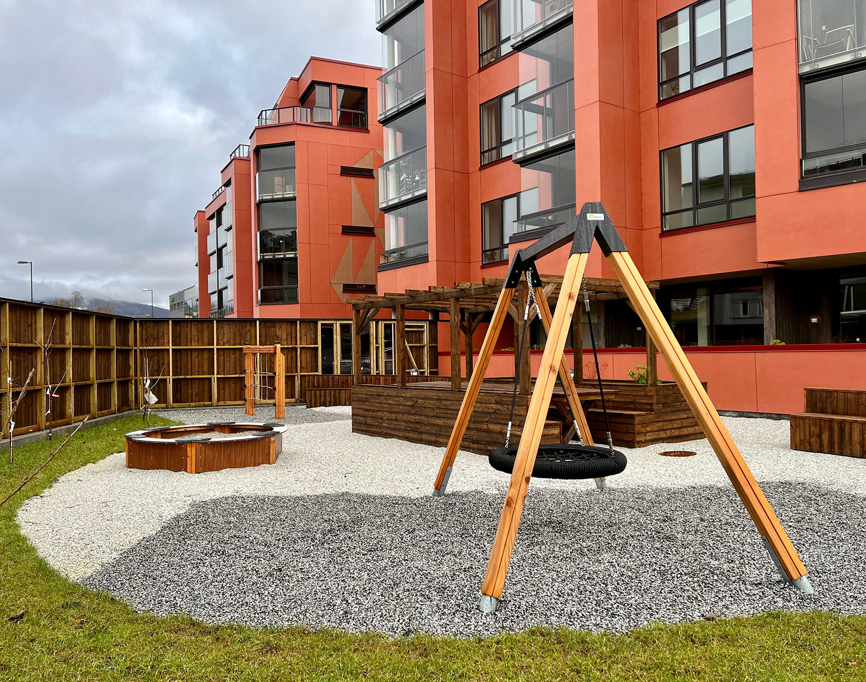 Her finder du fugleredegynge, sandkasse og klatrenet til stor glæde for de yngre beboere. Bænkeborde og blomsterkasser i lærk fastholder den røde tråd og giver en hyggelig ramme omkring boligområdet. Bænkebordene på tagterrassen gør det nemt at samles både store og små.