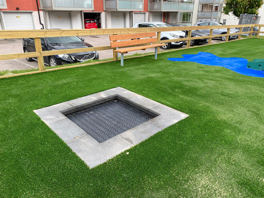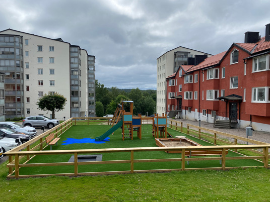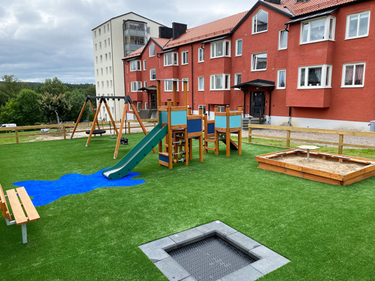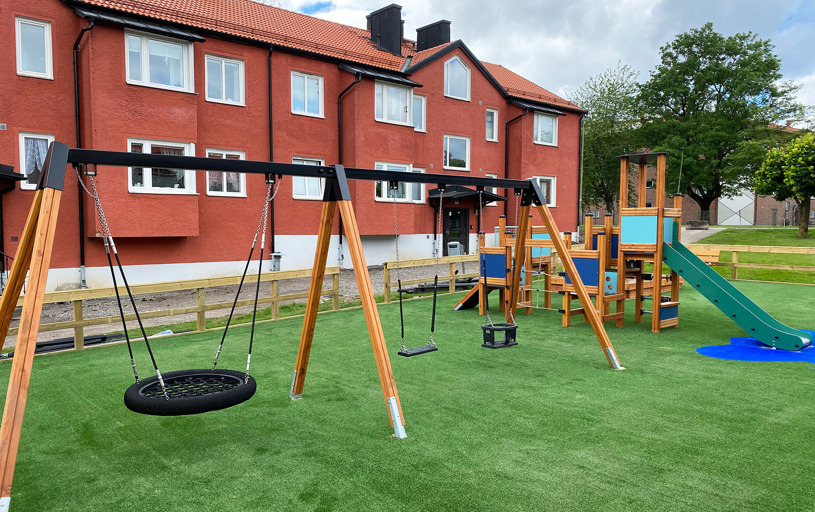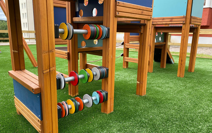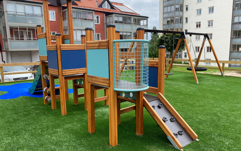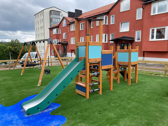 Legeudstyret falder smukt ind i omgivelserne med olieret lærketræ og detaljer i bløde blå nuancer. Sandkassen med sandbordet er designet til de yngste børn. Der er også udfordrende klatreleg med rutsjebane og naturligvis det populære gyngestativ med fugleredegynge til de lidt ældre børn.