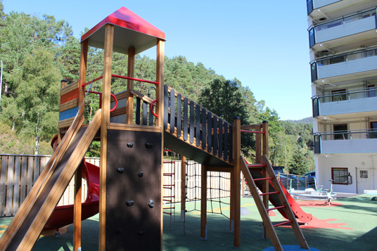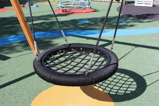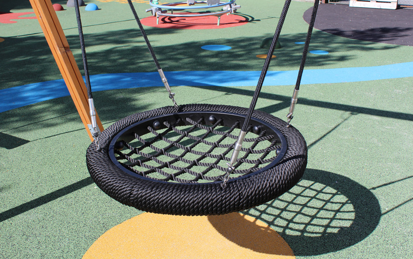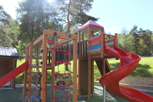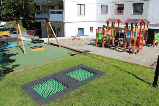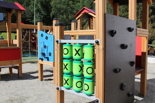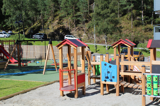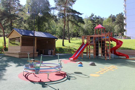 Det resulterede i en stor, åben og social legeplads med plads til store og små, hvor mønstre og spændende farver i underlaget tager legen til et nyt niveau. Legepladsen rummer både et legehus med motoriske udfordringer for de mindste samt et stort legemiljø med rutsjebaner, klatrenet og tårne for de store børn.