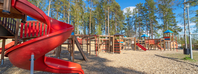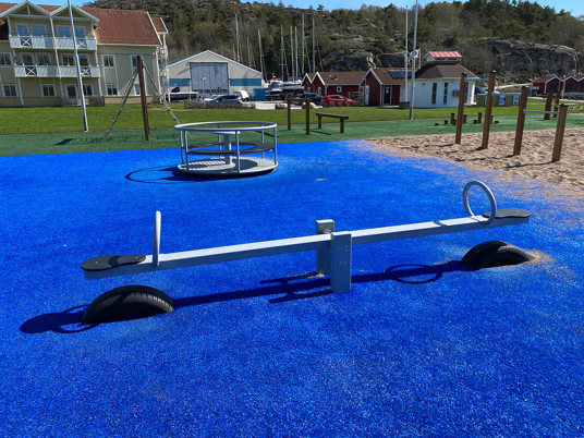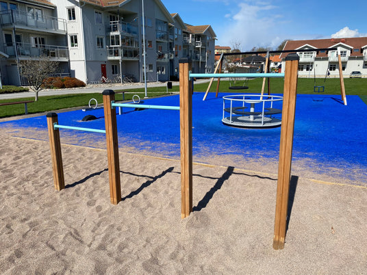 Sand- og kunstgræsoverflader i forskellige farver skaber de forskellige rum på legepladsen. Da alle redskaber er godkendte i henhold til EN 1176, er det ikke nødvendigt med hegn eller indhegninger for at adskille leg og træning – så her går leg og motion op i en højere enhed.
