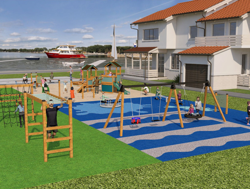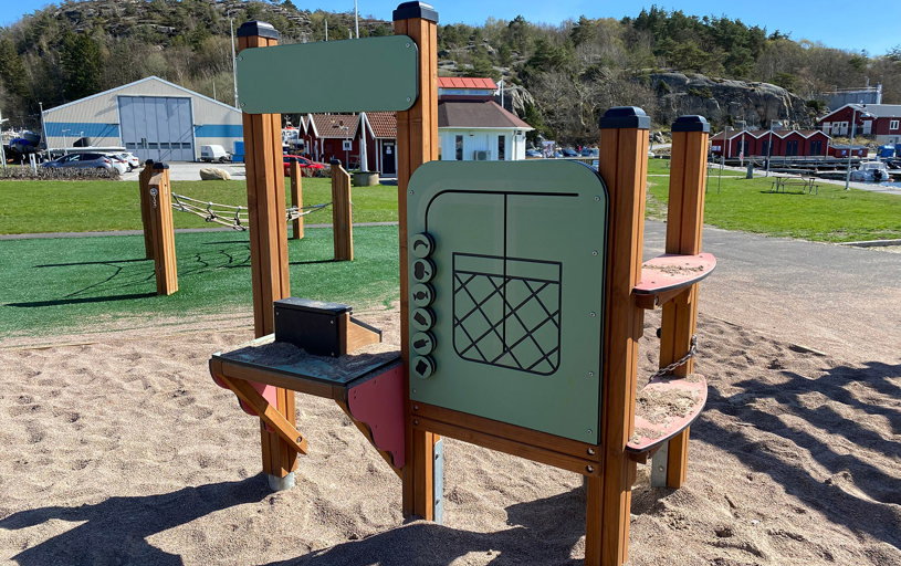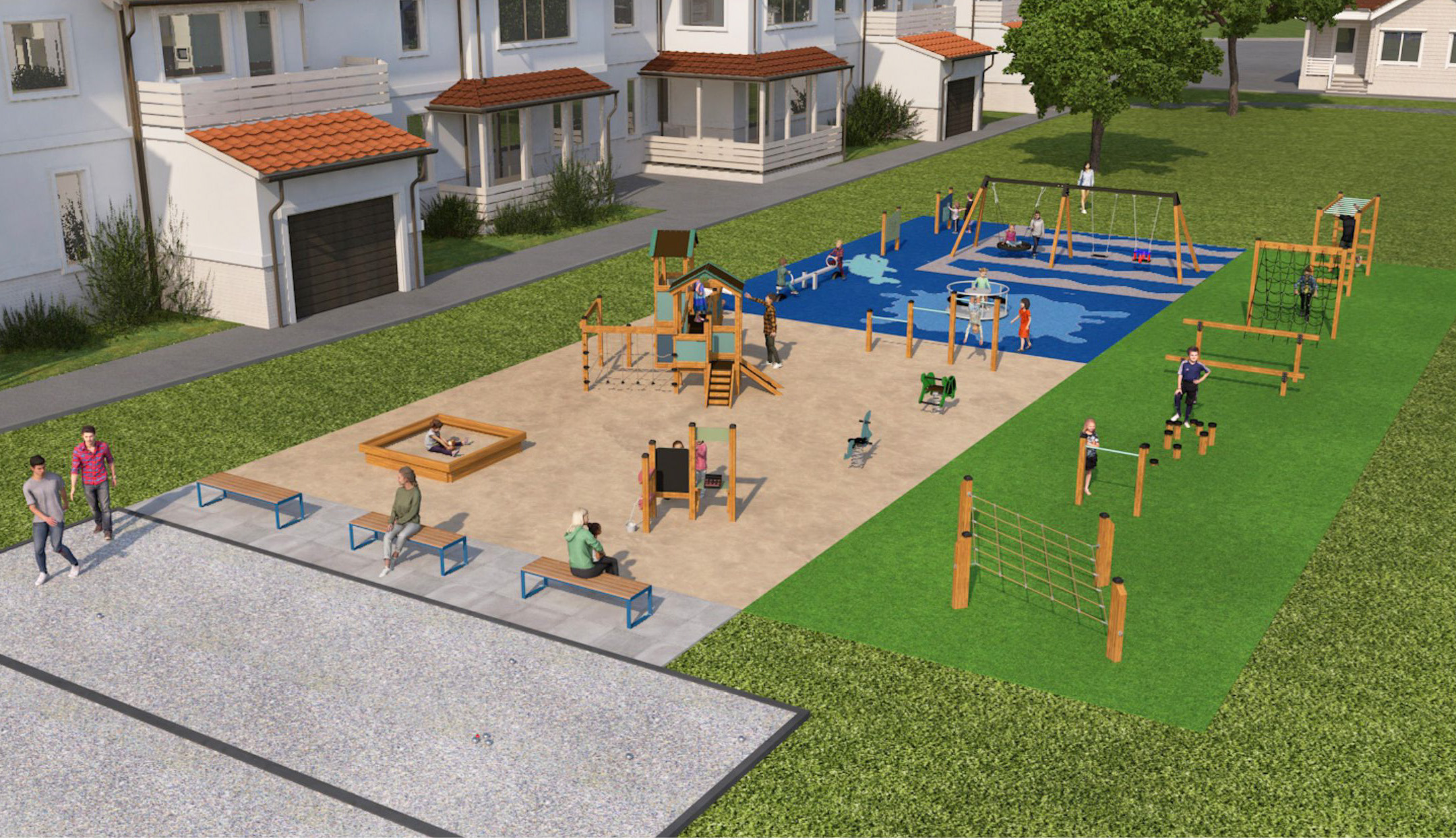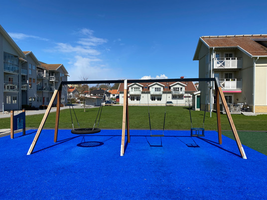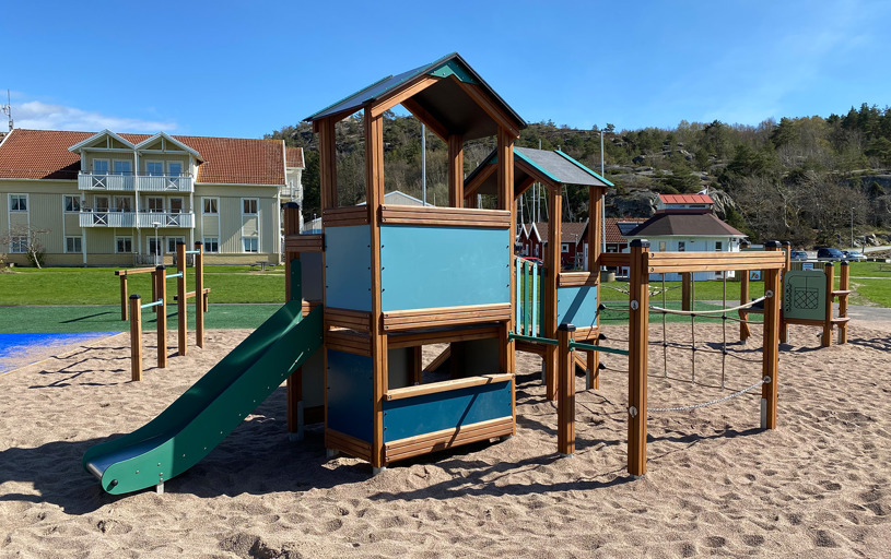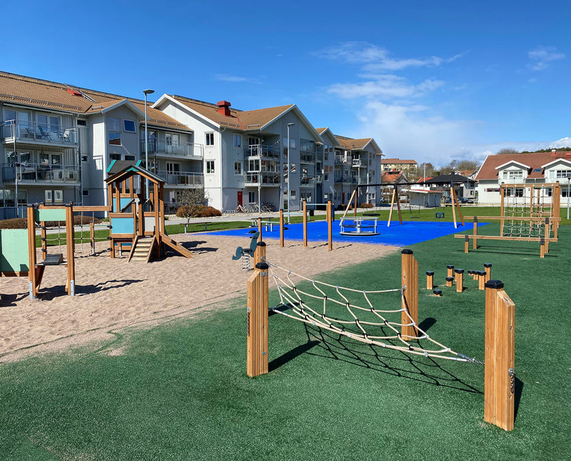 Vi var ansvarlige for at designe legepladsen, og vi valgte legeredskaber, der matchede kundens ønsker og behov. Der blev lavet en 3D-tegning af legepladsen for at visualisere, hvordan den kunne se ud. Der er en god blanding af udstyr, som passer til både yngre og ældre børn. Alt fra rolleleg, sandleg og gynger til snurreture, balance og klatring.