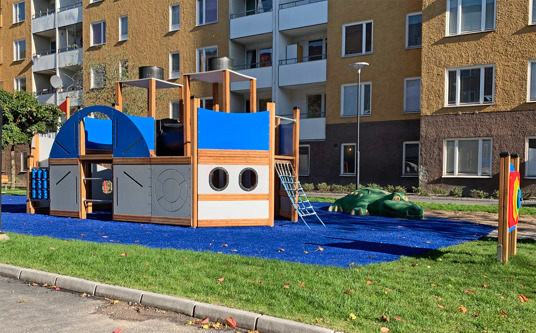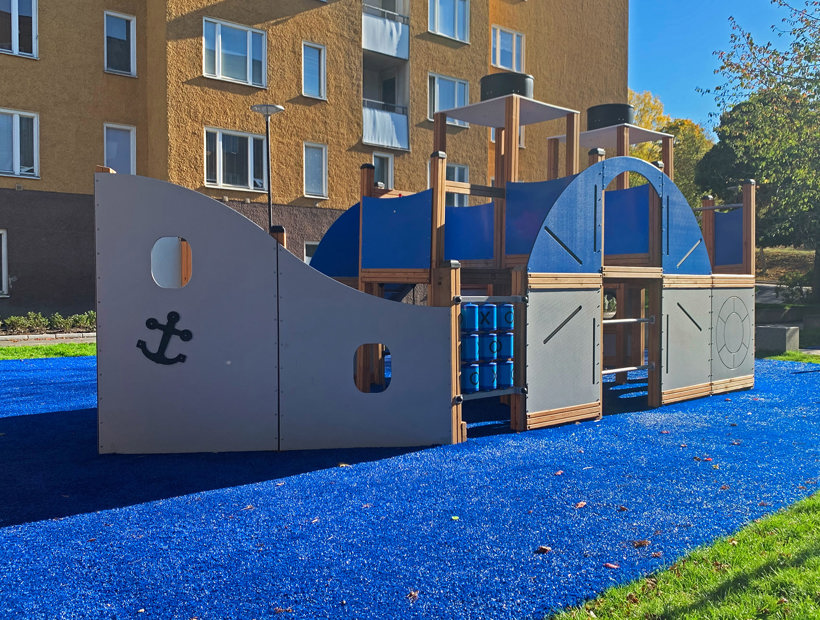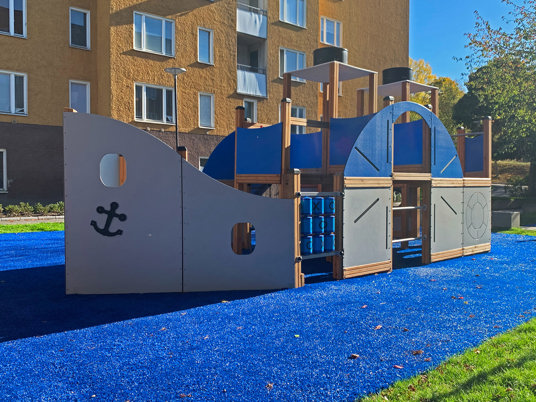 Et vand- og bådtema blev valgt til et af boligområderne. Her kan børnene lege pirater på dampbåden, lede efter krokodiller fra skibsmasten og sætte anker ved legehuset til en pause. Med det blå kunstgræs blev illusionen om det åbne hav til virkelighed – og det er nemt at fantasere om eventyr med vennerne på havet.