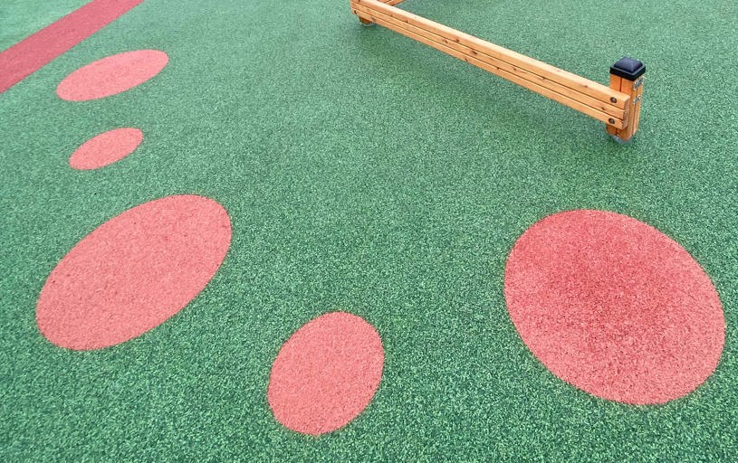 Legepladsen fik et ny faldunderlag med farverigt faldsikringsgummi. På det inspirerende mønster kan børn løbe på stier fra gynger og balancebjælker til slottet for mere leg og ballade.