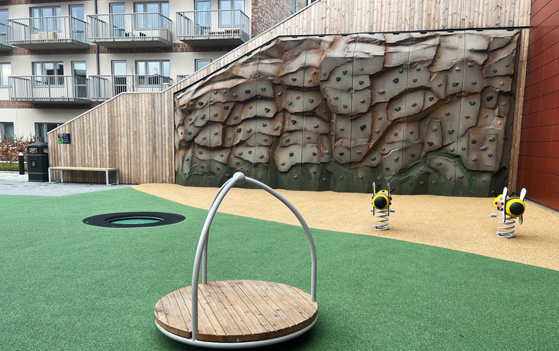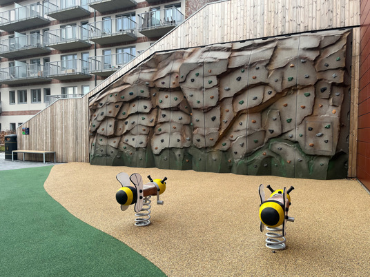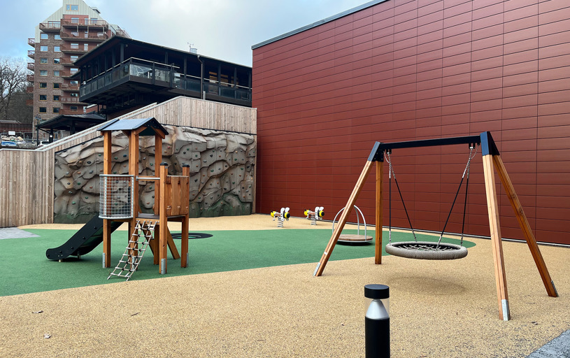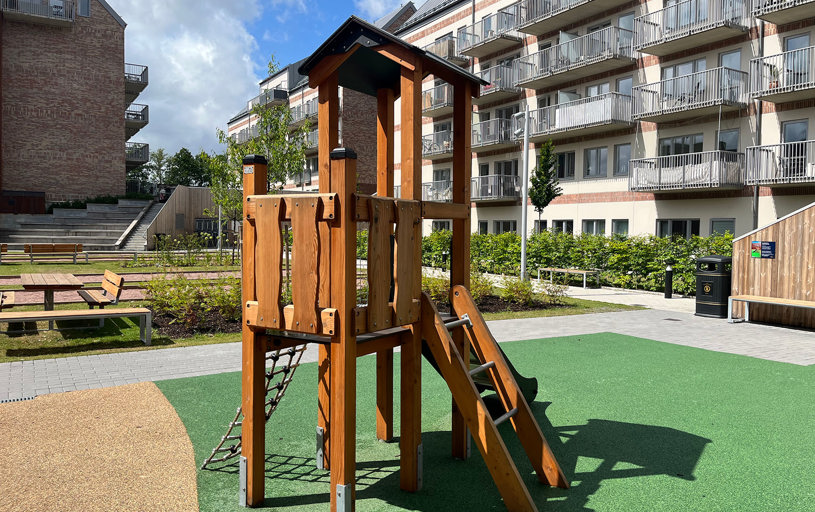Smukt beliggende legeplads i det nybyggede boligområde i Mölnlycke lidt udenfor Göteborg i Sverige. Legepladsen ligger lige ved siden af den nye Wallenstam Arena og byder på mange legeoplevelser til alle børn og unge i området. Spin, hop, sving og klatre alt hvad du kan!