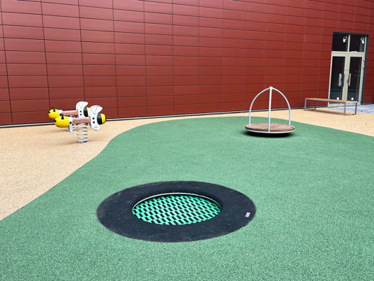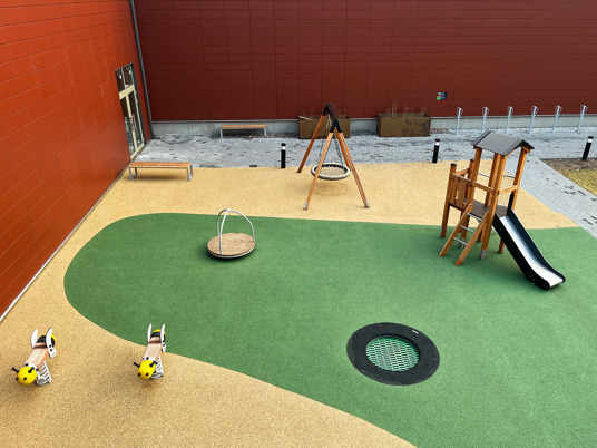 Det farverige faldunderlag i farverne sandmix og mosgrøn falder rigtig fint ind i omgivelserne.