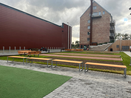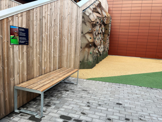 For dem, der trænger til en pause fra legen eller bare vil sidde og hygge, er der her placeret fine parkbænke. Tucana-bænken fra Mobilis Design er lavet af samme træsort som legeredskaberne, hvilket giver perfekt harmoni.