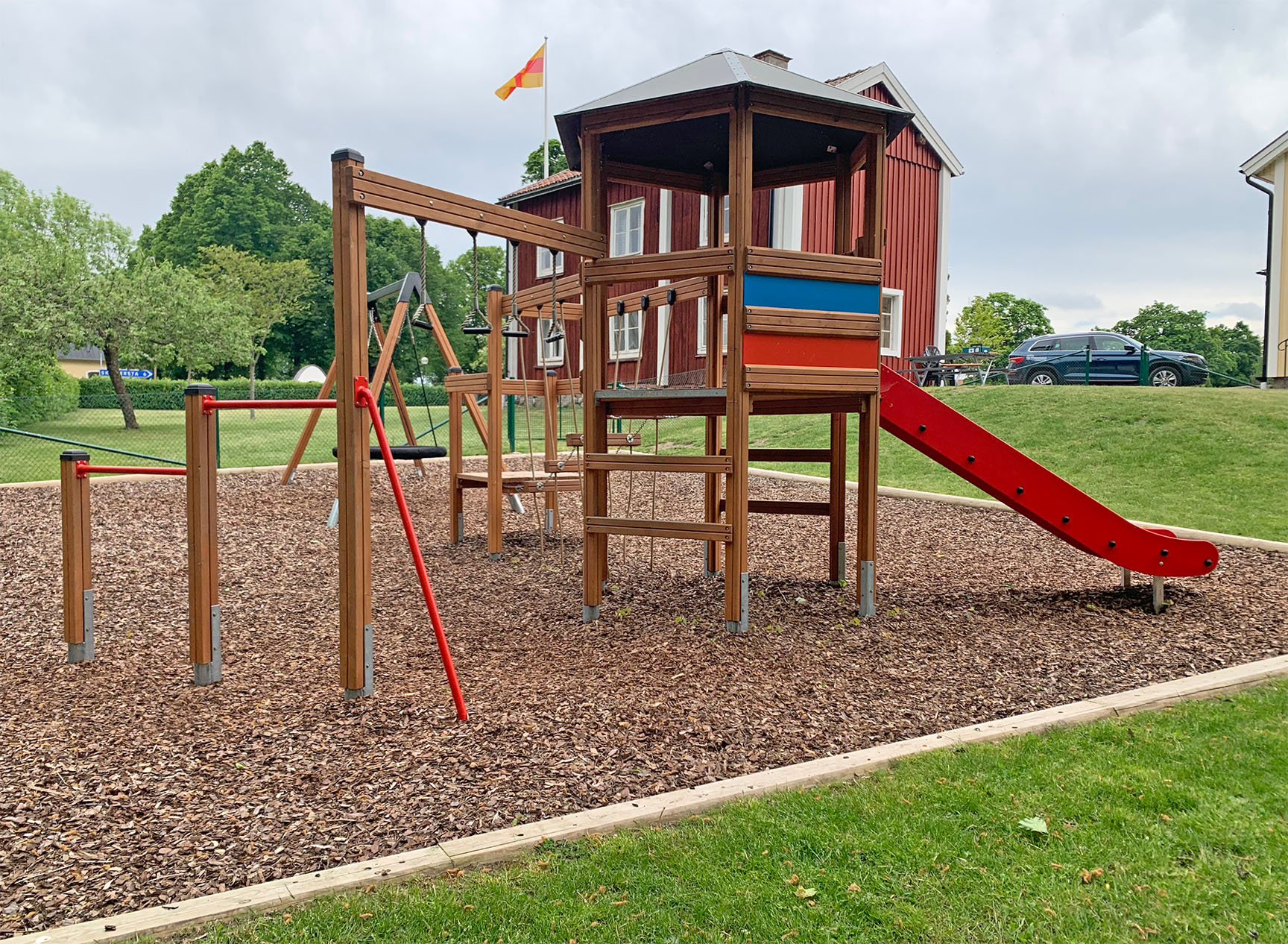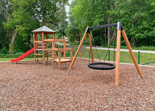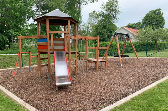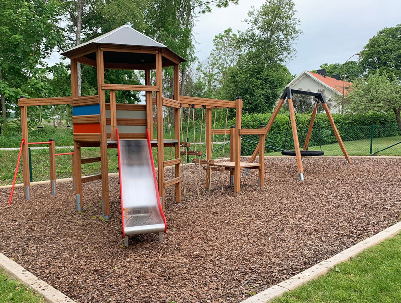 At det hele hænger sammen betød, at der blev sparet plads – og så var der også plads til gyngestativet med fugleredegyngen, som har plads til flere børn.