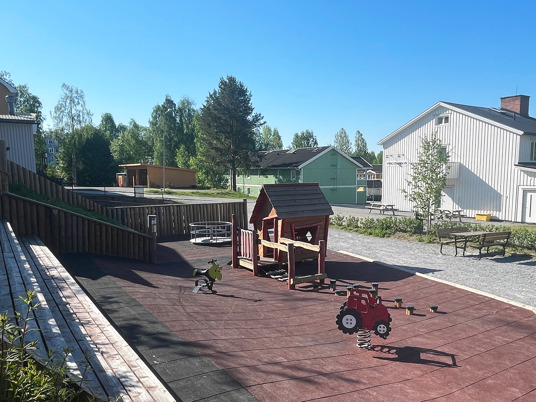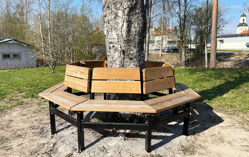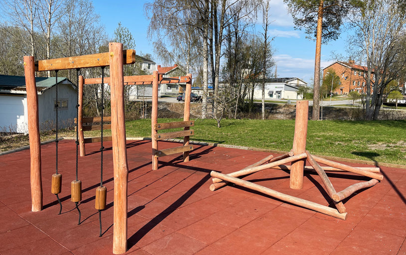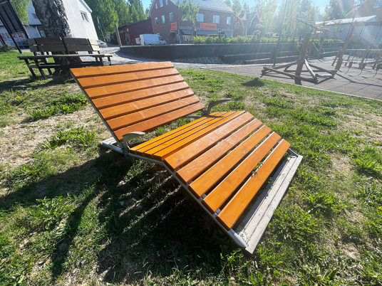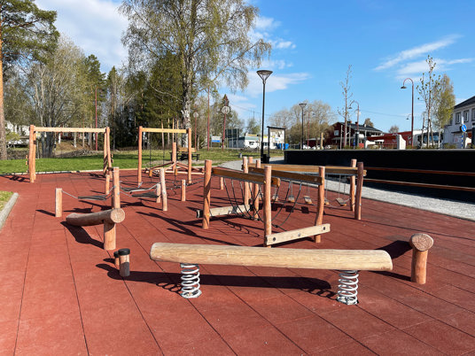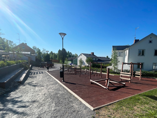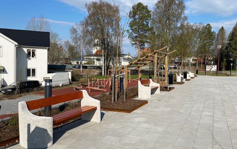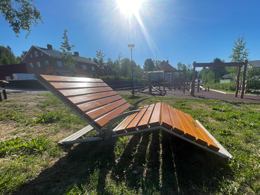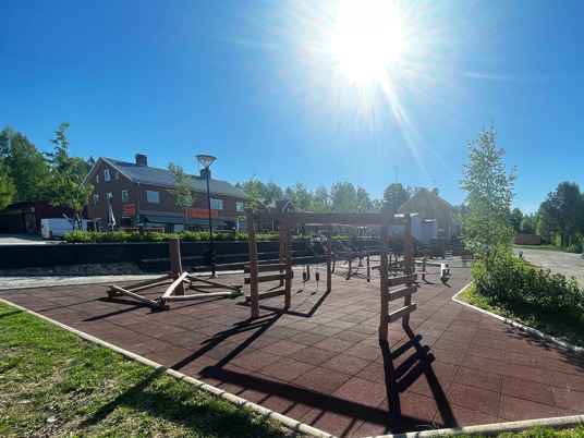 Bjurholms centrum har fået et nyt naturligt mødested, som har løftet hele området. Med bænke, liggestole og en dejlig legeplads kan hele byen samles samme sted. En vellykket kombination af park og legeplads!