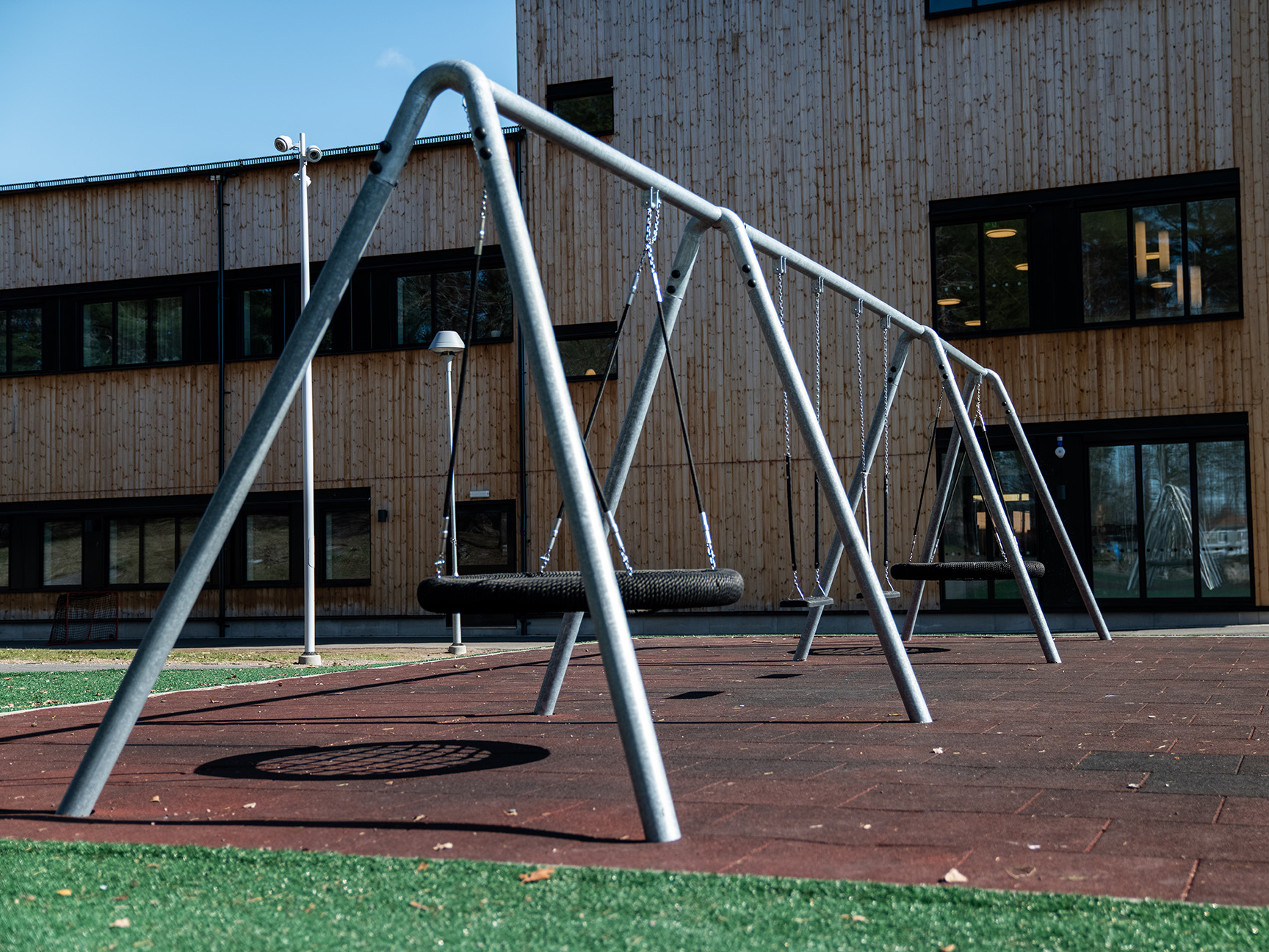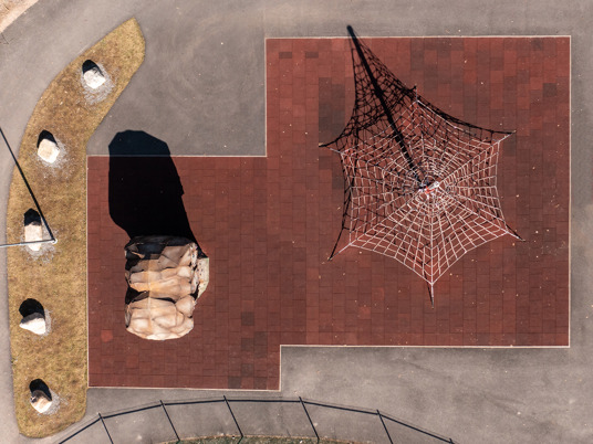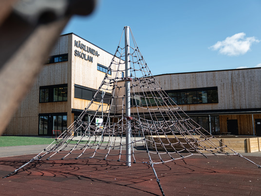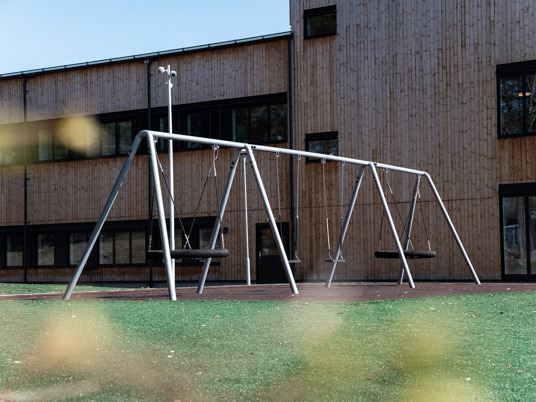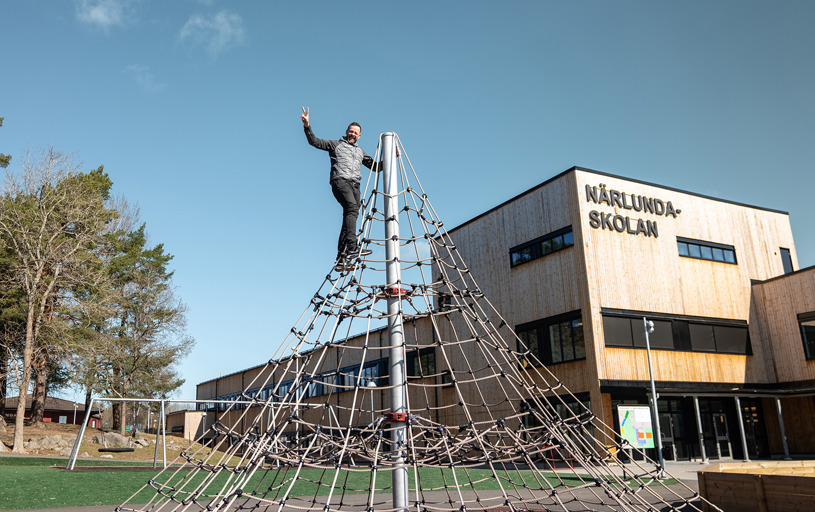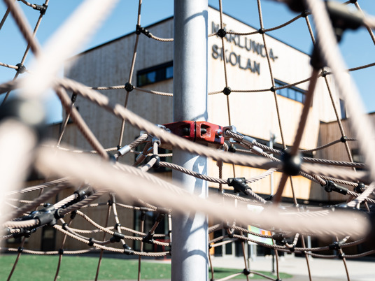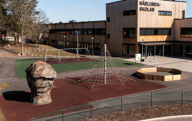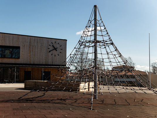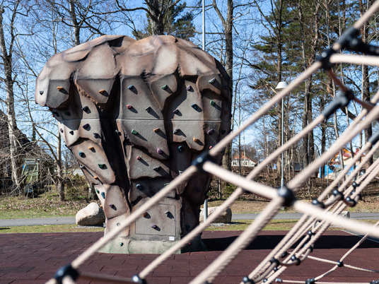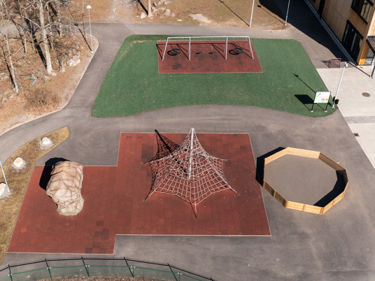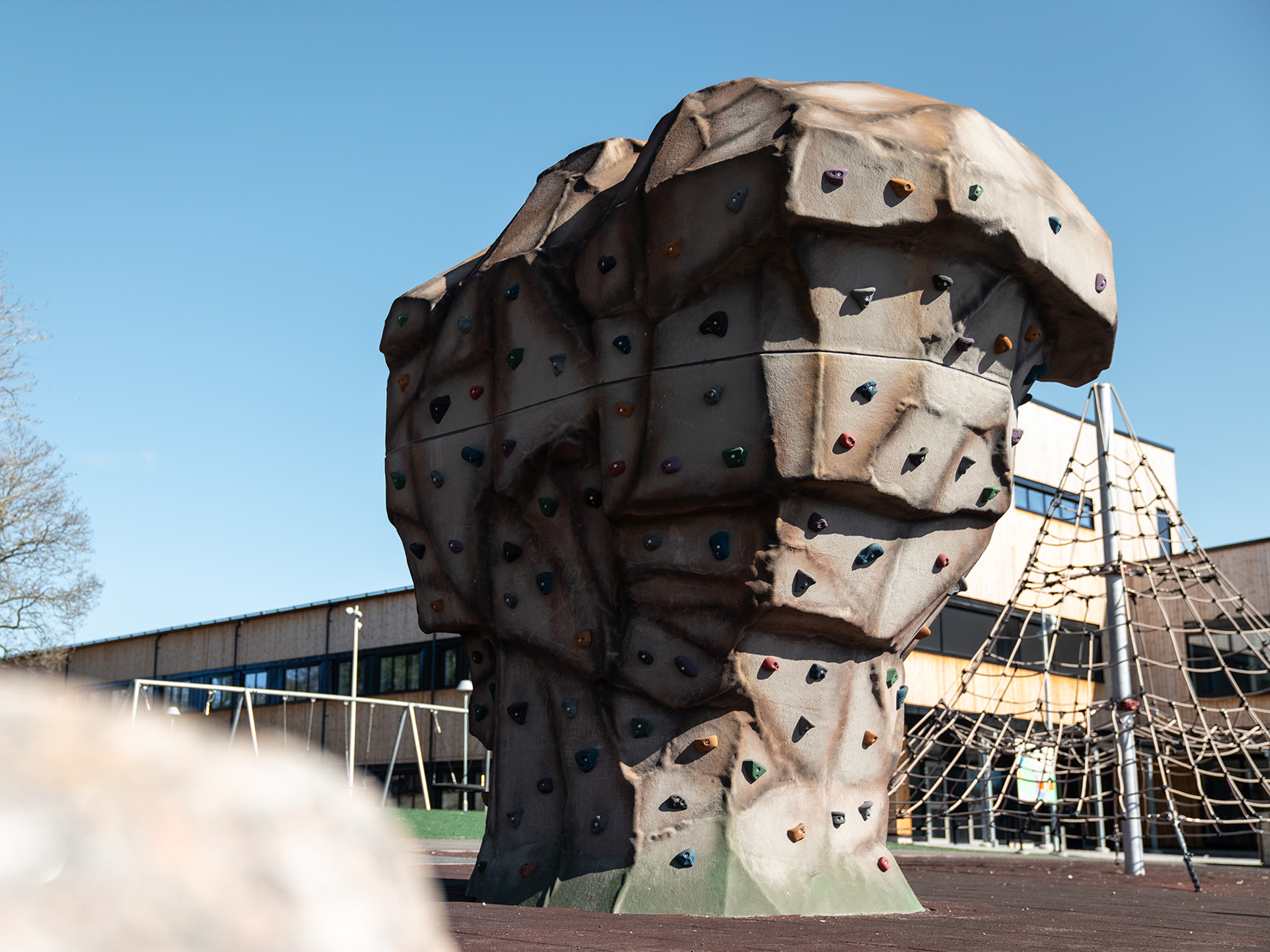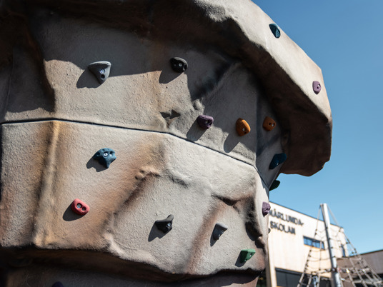 Klatrepyramiden Gigantis måler 5 meter og den store Boulder Rocks klatresten måler godt 4 meter. Det giver spændende klatreudfordringer for eleverne på skolen, som her kan tanke ny energi i frikvarteret. Med de rustrøde faldsikringsplader nedenunder føles det trygt og sikkert at teste sine færdigheder.