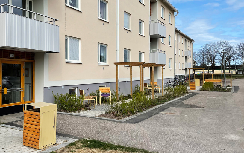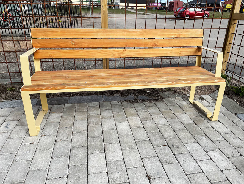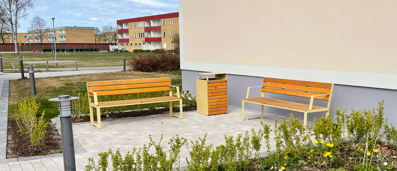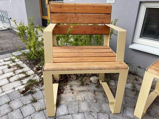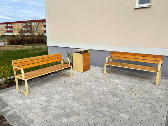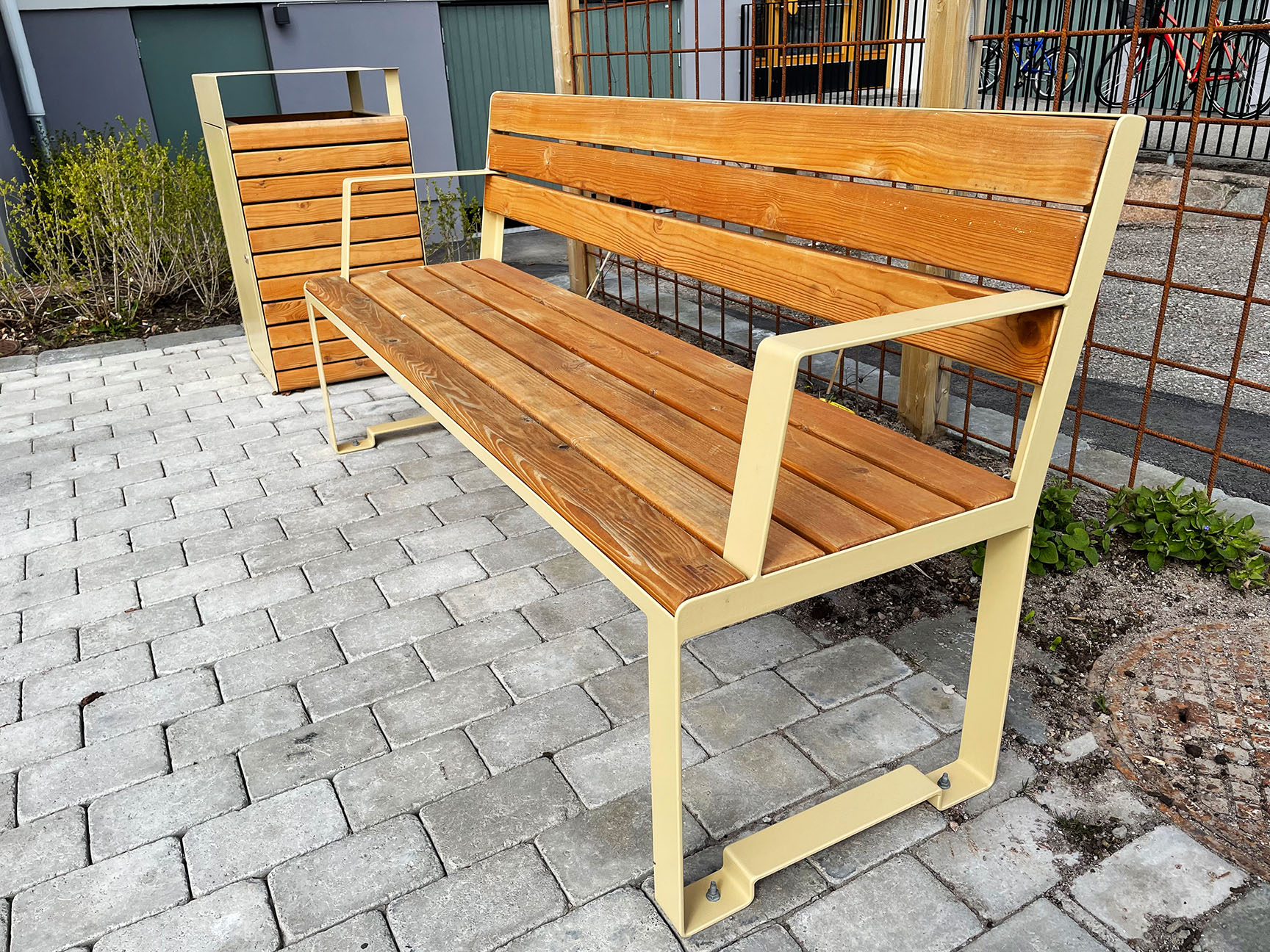 Parkmøblerne er fremstillet af holdbart lærketræ, som harmonerer flot med den nybyggede pergola og planteunderstøtningen, der snart vil blive dækket af smukke klatreplanter. Stålet er pulverlakeret i RAL-farven 1001 Beige, hvilket giver hele gården et lysere og mere frisk udtryk.