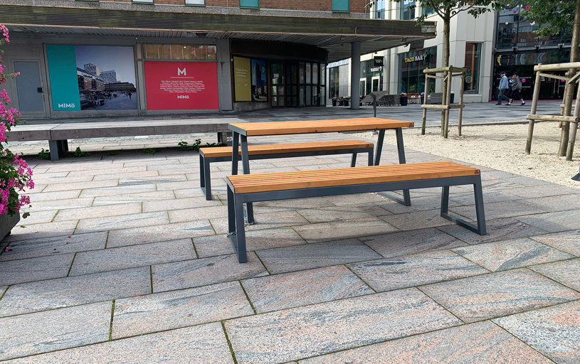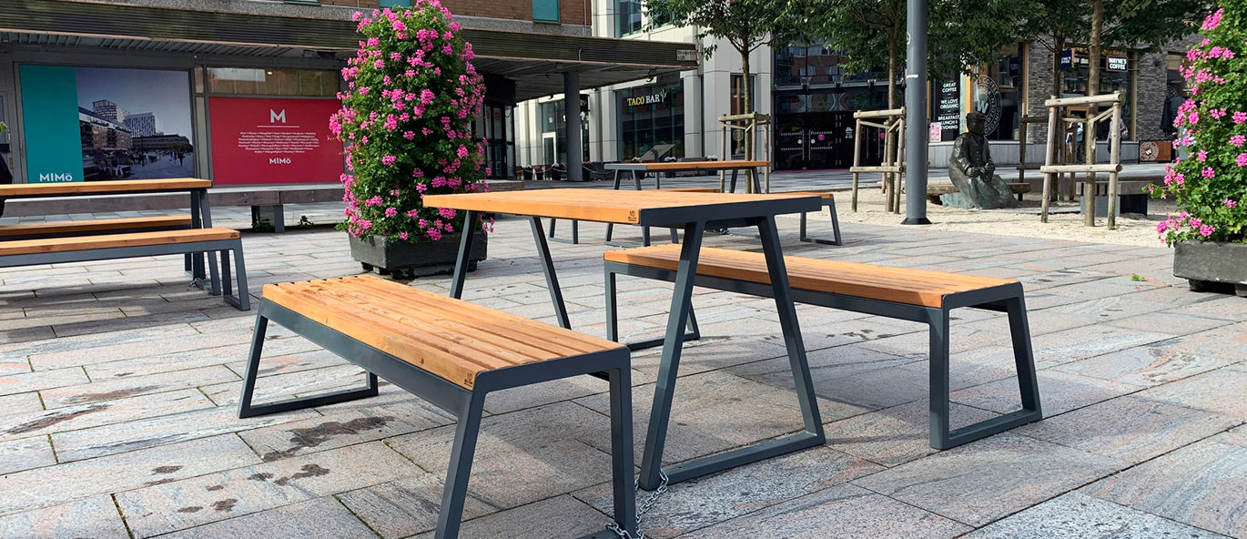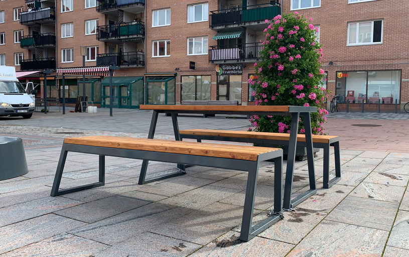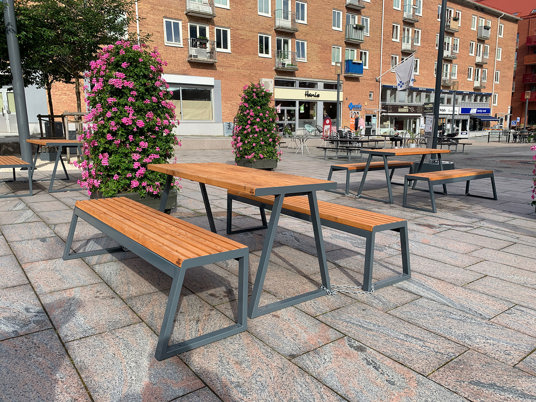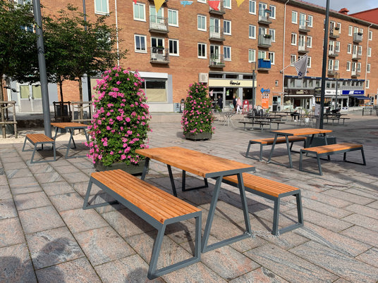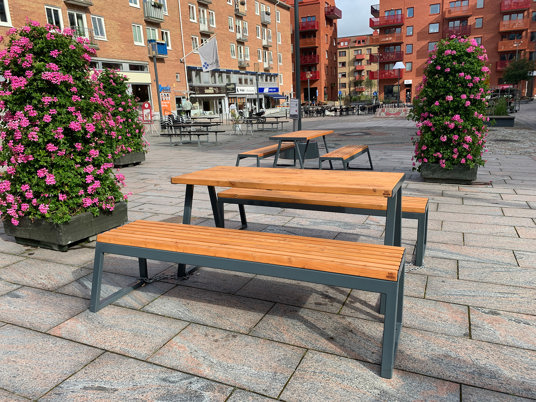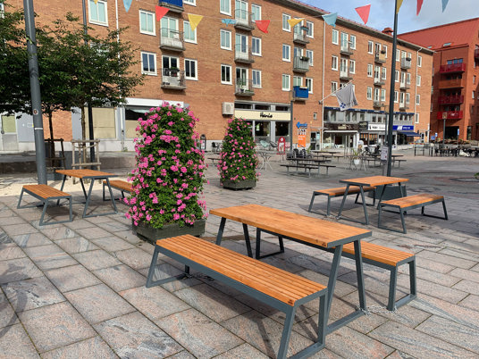 Statuen Albert, skabt af kunstneren Lars Spaak, har tidligere prydet torvet og sidder nu igen med sin sæk mel på et møllehjul, mens han fortæller historier om det gamle Mölndal. Lige i nærheden er der opsat borde og bænke fra Mobilis Designs møbelserie PICTOR. Parkmøblerne er pulverlakeret i RAL 7011 Iron Grey, en grå nuance, der genkendes i granitbelægningen og også på Albert, der sidder i skyggen under træerne.