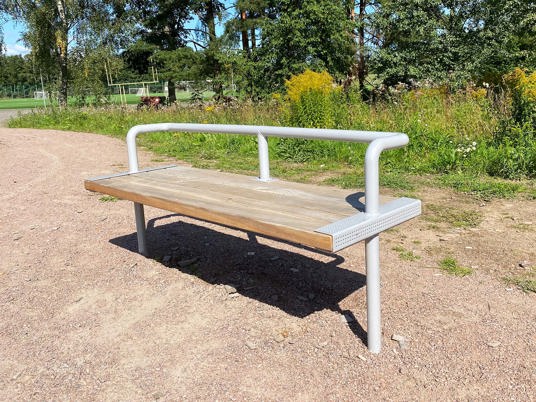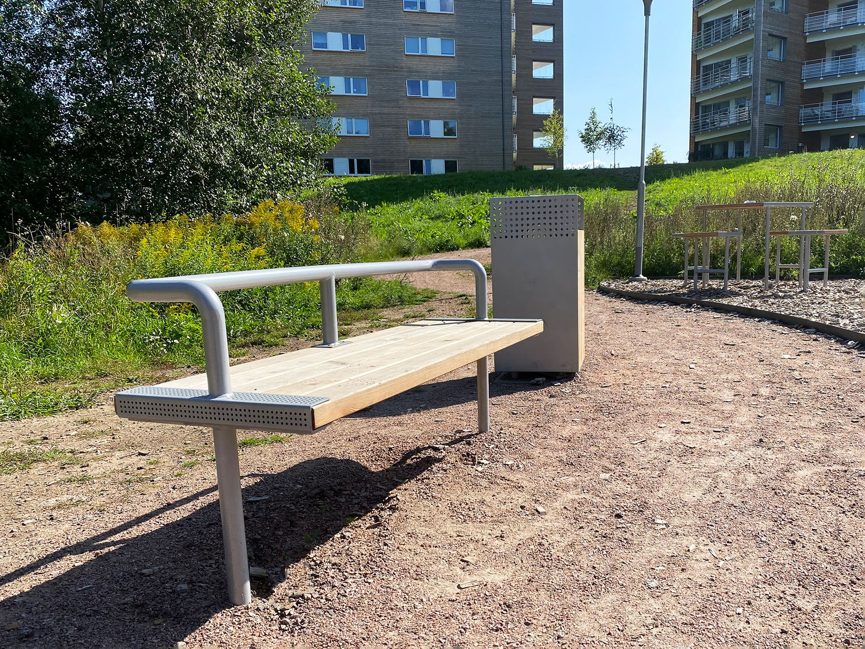 De smukke træfacader og balkonrækværk i lakeret stål på husene var afgørende for valget af parkmøbler. Den moderne design af møbelgruppen SCORPIUS passede perfekt ind i miljøet omkring de nybyggede højhuse. Parkmøblerne er fremstillet af lærketræ, og stålet blev pulverlakeret i RAL-farven 9006 White Aluminium for at matche farven på husenes ståldetaljer.