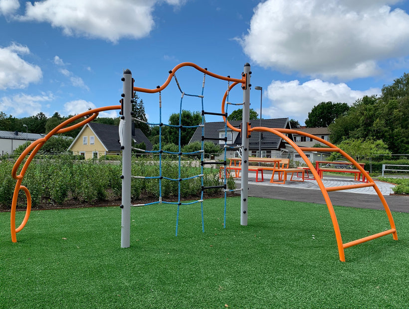 Spændende og indbydende legeredskaber blev udvalgt til skolegårdens ombygning. Parkmøblerne blev pulverlakeret i de samme farver som legeredskaberne. Matchende røde og orange farvetoner gennemstrømmer hele skolemiljøet.