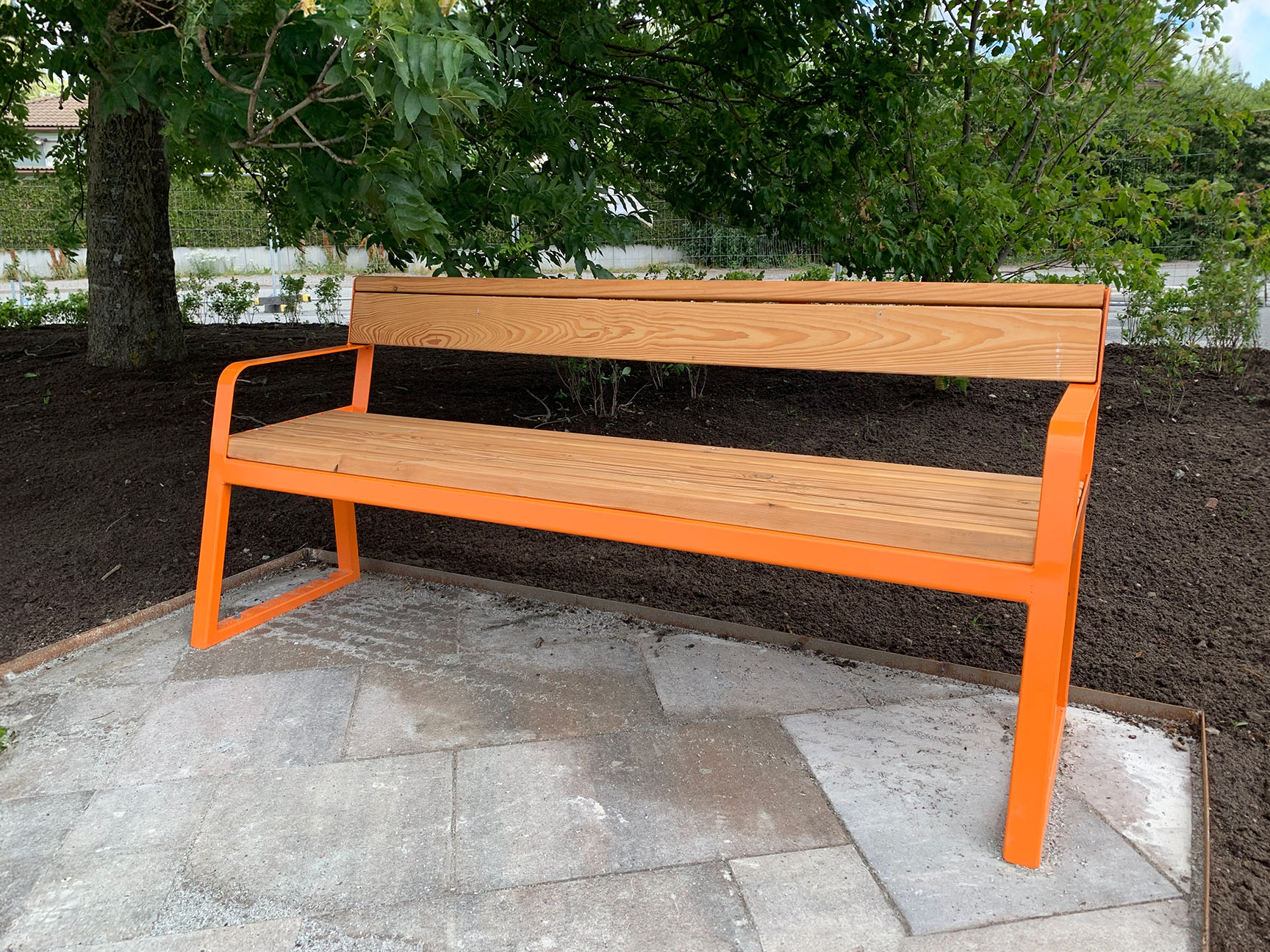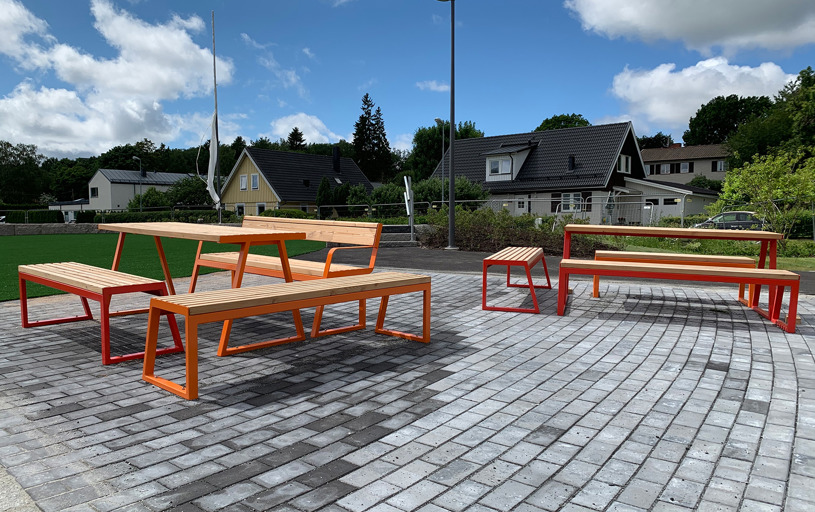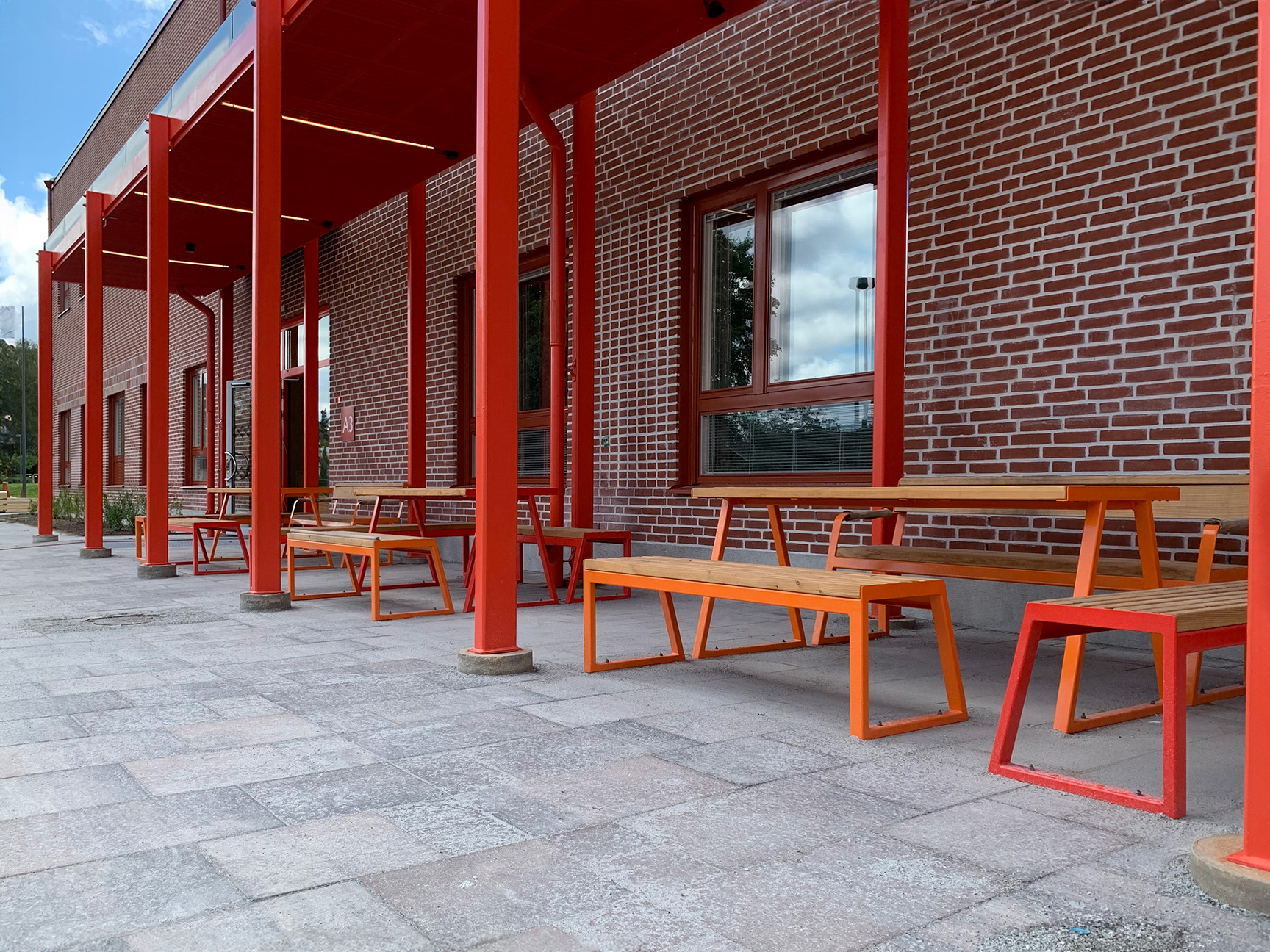 RAL 2003 Pastel orange og RAL 2002 Vermilion, som er den røde nuance, står flot frem mod de grå belægningssten samt græsset og beplantningen i baggrunden. Her kan skolens personale og skolebørnene både nyde en pause og faktisk også holde udendørs undervisning, når vejret tillader det.