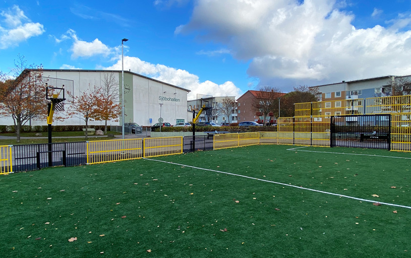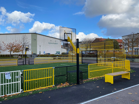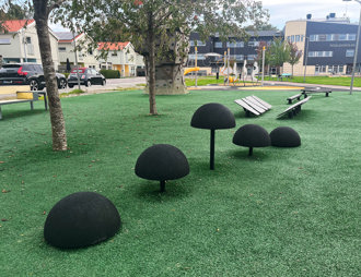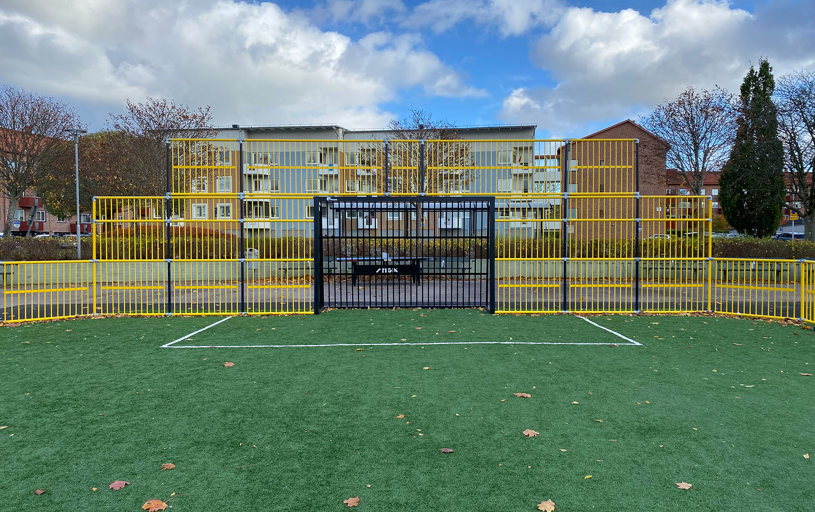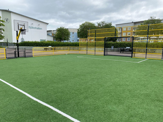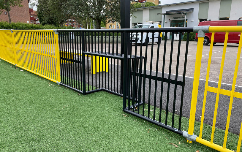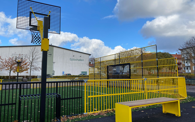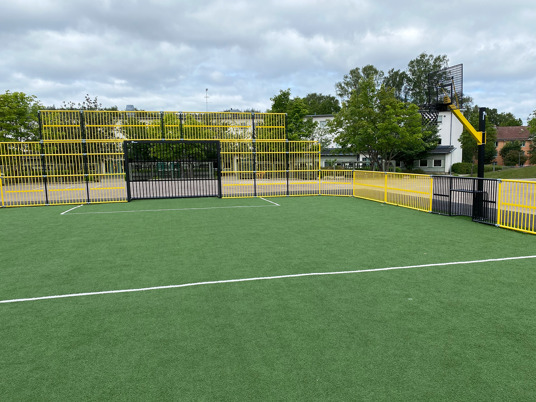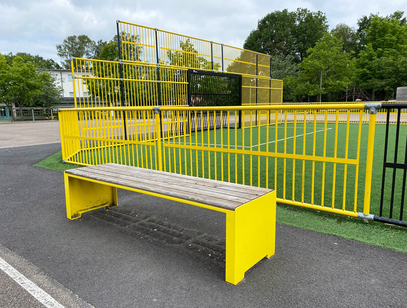 Uden for arenaen har vi placeret nogle bænke fra CENTAURUS-familien fra Mobilis Design. De er perfekte at sætte drikkeflasken på, når man spiller bold i arenaen. Der er også pladser til udskiftere eller tilskuere, når skoleholdet spiller kamp.