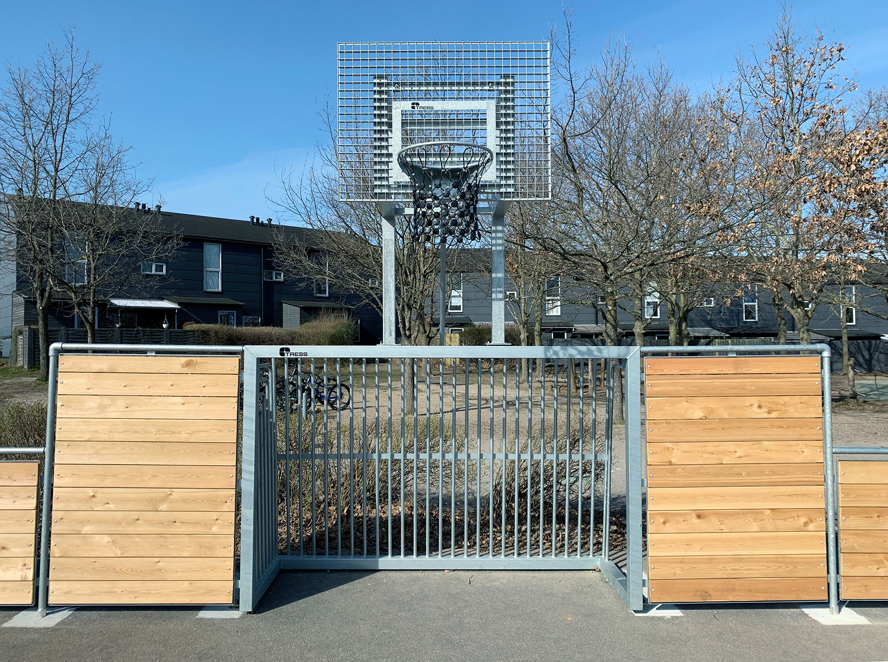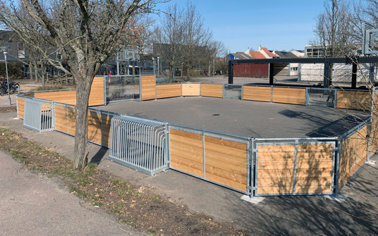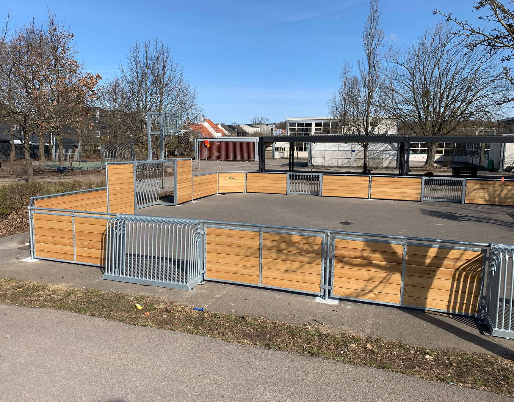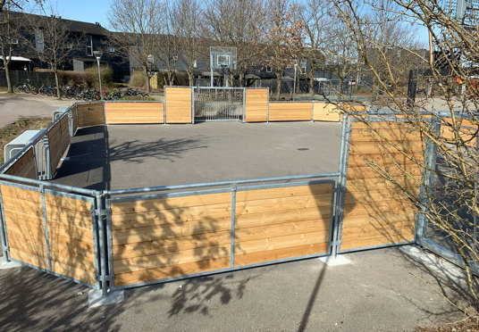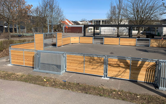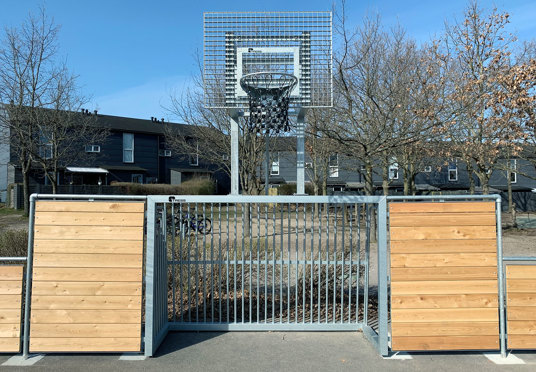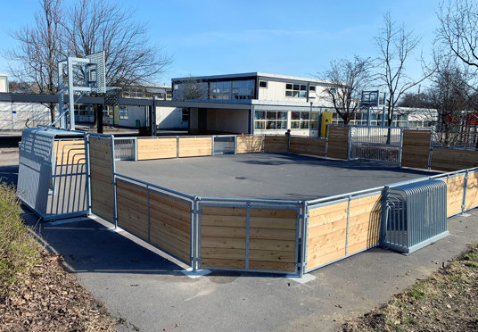 På Skovvejens Skole Øst i Ballerup trængte den gamle multibane til at blive udskiftet. Vi har leveret en splinterny multibane til skolen – og monteret den på samme område og underlag midt i skolegården, hvor den igen står flot som multifunktionelt midtpunkt.