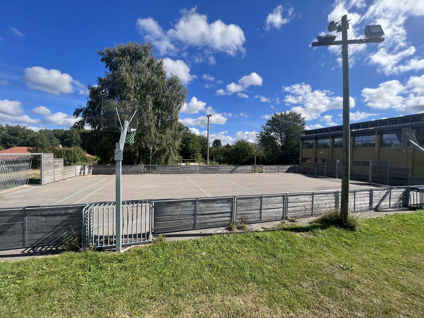 Multibanen på Grønnevang Skole Østervang i Hillerød blev oprindeligt opført i 2013 – og +10 år efter står banen stadig flot. De eneste skræmmer er overfladiske i form af grafitti og et par manglende brædder som følge af hærværk, der nemt kan erstattes af nye.