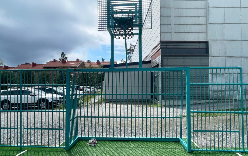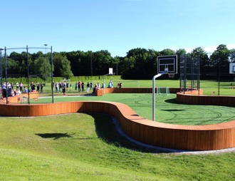 Multiarenaens farver skiller sig ud og lyser op i området. Det grønne kunstgræs står i flot kontrast til den blågrønne multibane og samlet set løfter det skoleområdets samlede udtryk.