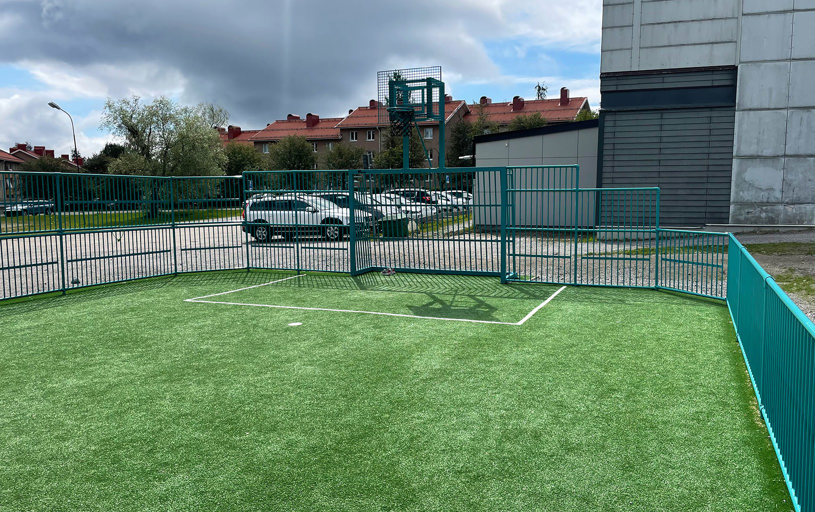 Idrætspladsen blev omformet fra en tom, kedelig plads til en indbydende, farverig multiarena. Der er plads til at spille bold, afholde idrætstimer og mange andre aktiviteter.