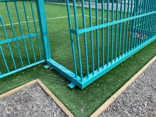 Kunden vidste, hvad de ville have: Old Trafford multibanen i stål uden langsidernes basketballstativer og minimål. Basketballstativerne blev i stedet monteret oven på fodboldmålene på de korte sider. Det perfekte eksempel på, at vi altid kan tilpasse vores multiarenaer, så de passer til dine behov og ønsker!