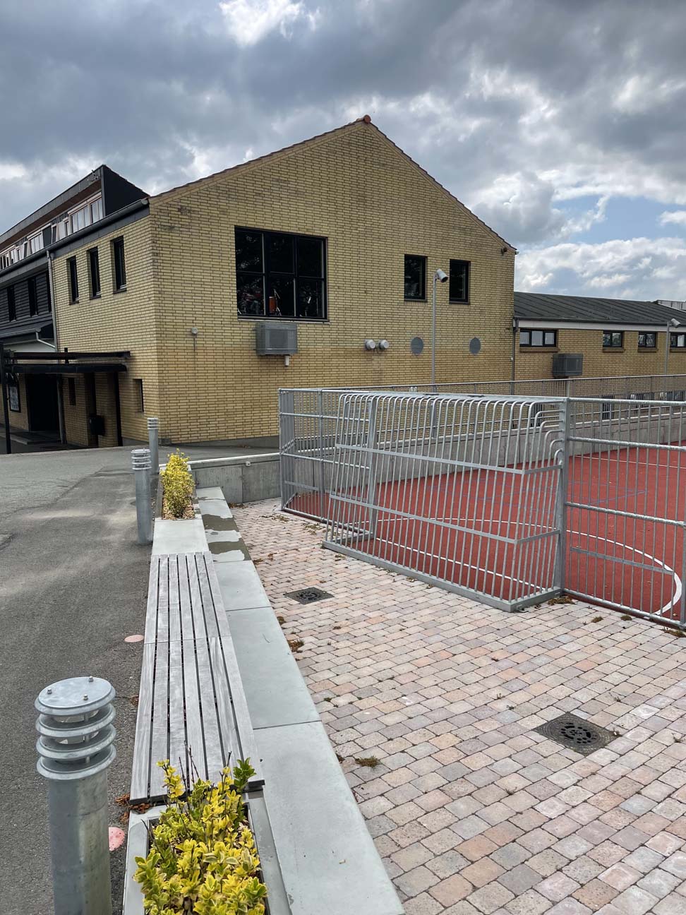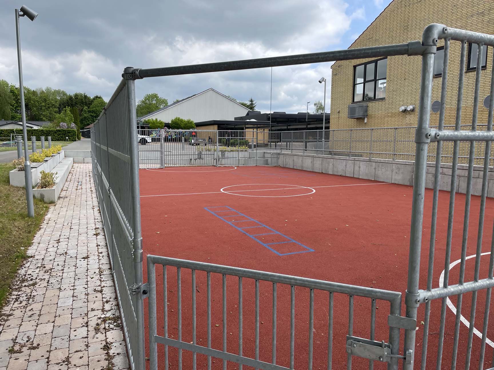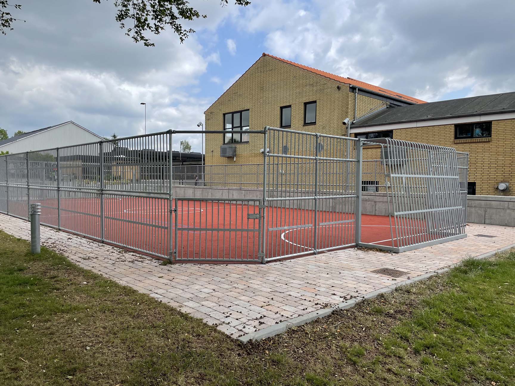Det var vigtigt for skolen, at multibanen kunne tilpasses skolegårdens terræn og integreres med en støttemur ind mod bygningerne. Den opgave løste vi selvfølgelig uden problemer ved at tilpasse multibanen.