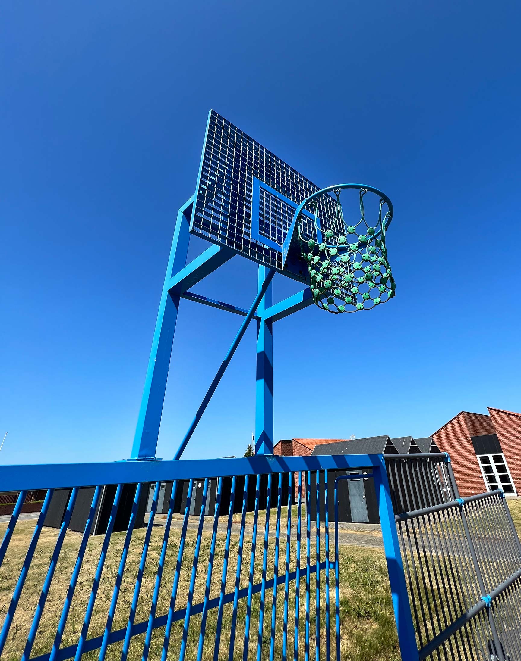 Den står ved Fiskeriskolen i Thyborøn. Her havde skolen et ønske om at få et udeområde med plads til masser af aktivitet – og som passede ind i naturen længst mod vest.
