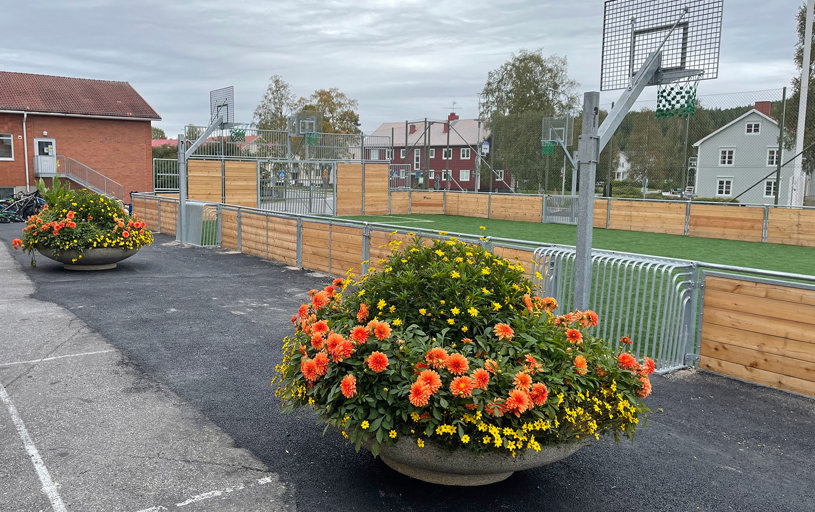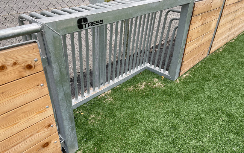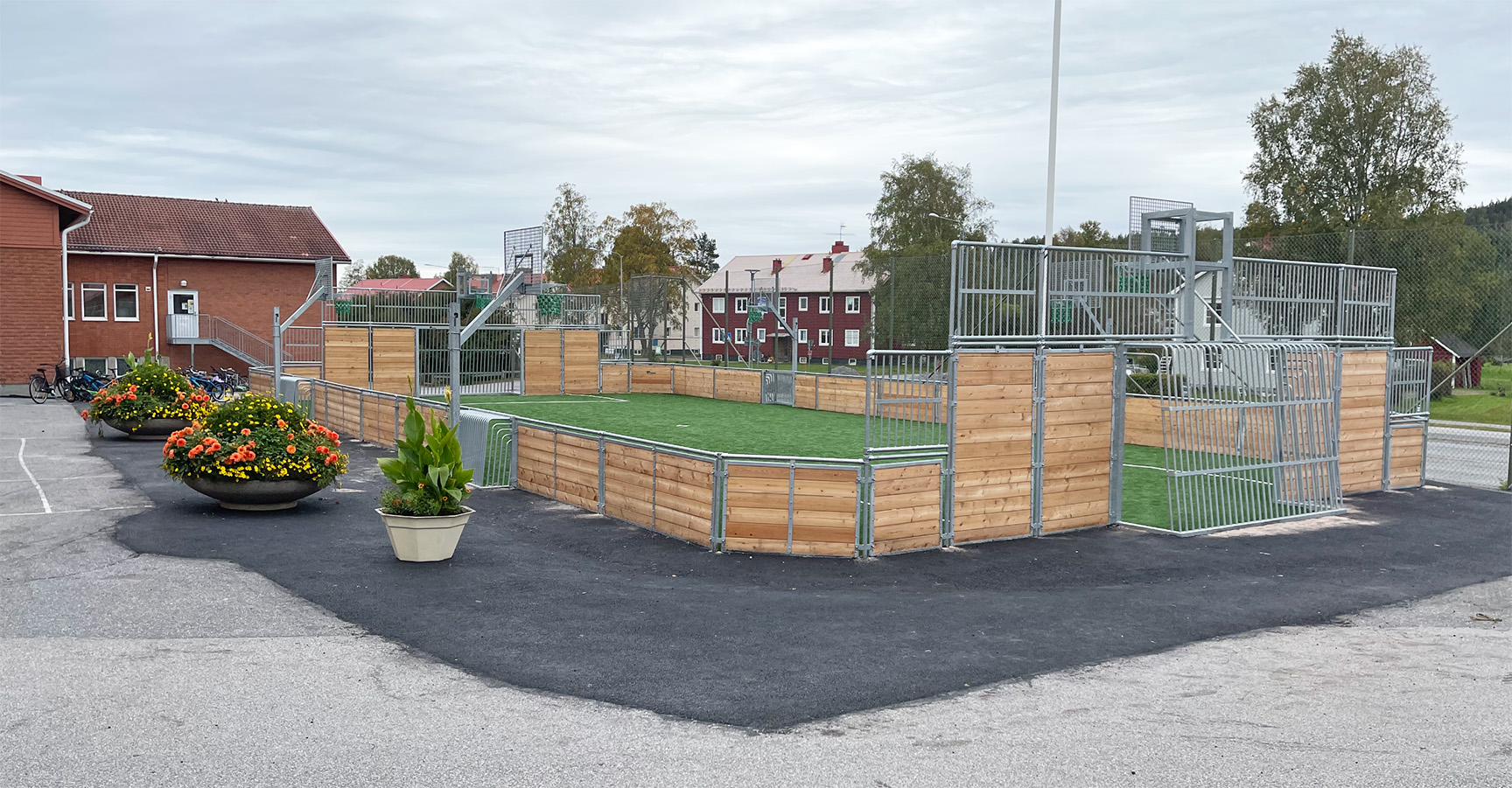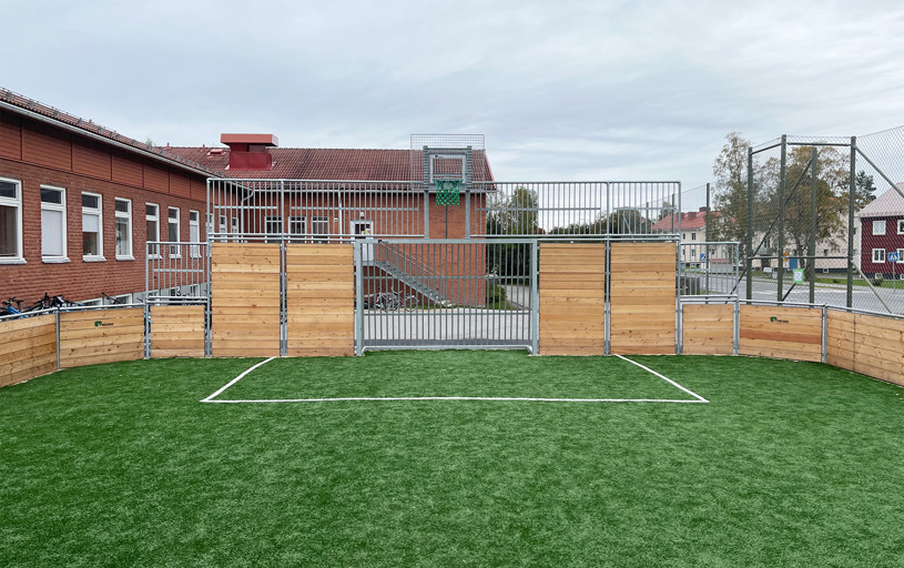Multiarenaen af lærk og varmgalvaniseret stål – her i en specialudgave med lavere langsider. Alle hjørner er 45 grader, hvilket betyder, at bolden altid er i bevægelse. Ved du godt, at vi kan tilpasse vores multibaner til netop dit projekt?