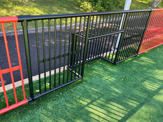 Farvekombinationen skiller sig virkelig ud og giver et cool indtryk, når man kommer ind i skolegården. Det perfekte sportsområde til både skole og fritid.