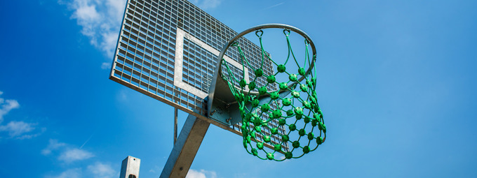 Fra et tomt, kedeligt område til en indbydende multianvendelig arena! Her kan børn spille basketball, fodbold og floorball både på langs og på tværs af banen.